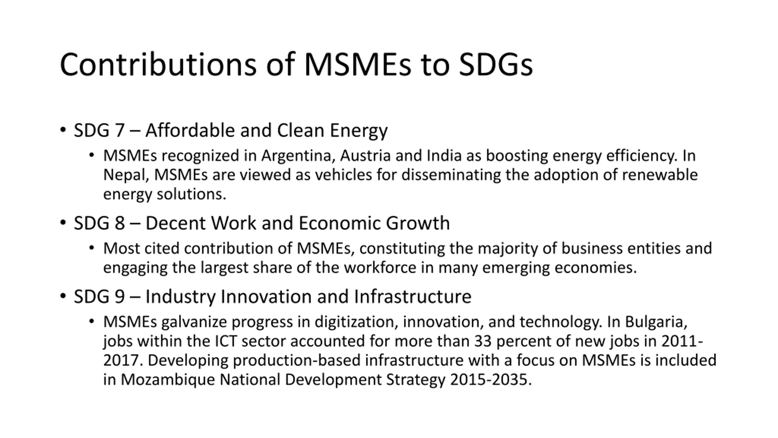Contributions of MSMEs to SDGs SDG 7 Affordable and Clean Energy MSMEs recognized in Argentina, Austria and India as boosting energy efficiency. In Nepal, MSMEs are viewed as vehicles for disseminating the adoption of renewable energy solutions. SDG 8 Decent Work and Economic Growth Most cited contribution of MSMEs, constituting the majority of business entities and engaging the largest share of the workforce in many emerging economies. SDG 9 Industry Innovation and Infrastructure MSMEs galvanize progress in digitization, innovation, and technology. In Bulgaria, jobs within the ICT sector accounted for more than 33 percent of new jobs in 2011- 2017. Developing production-based infrastructure with a focus on MSMEs is included in Mozambique National Development Strategy 2015-2035.
