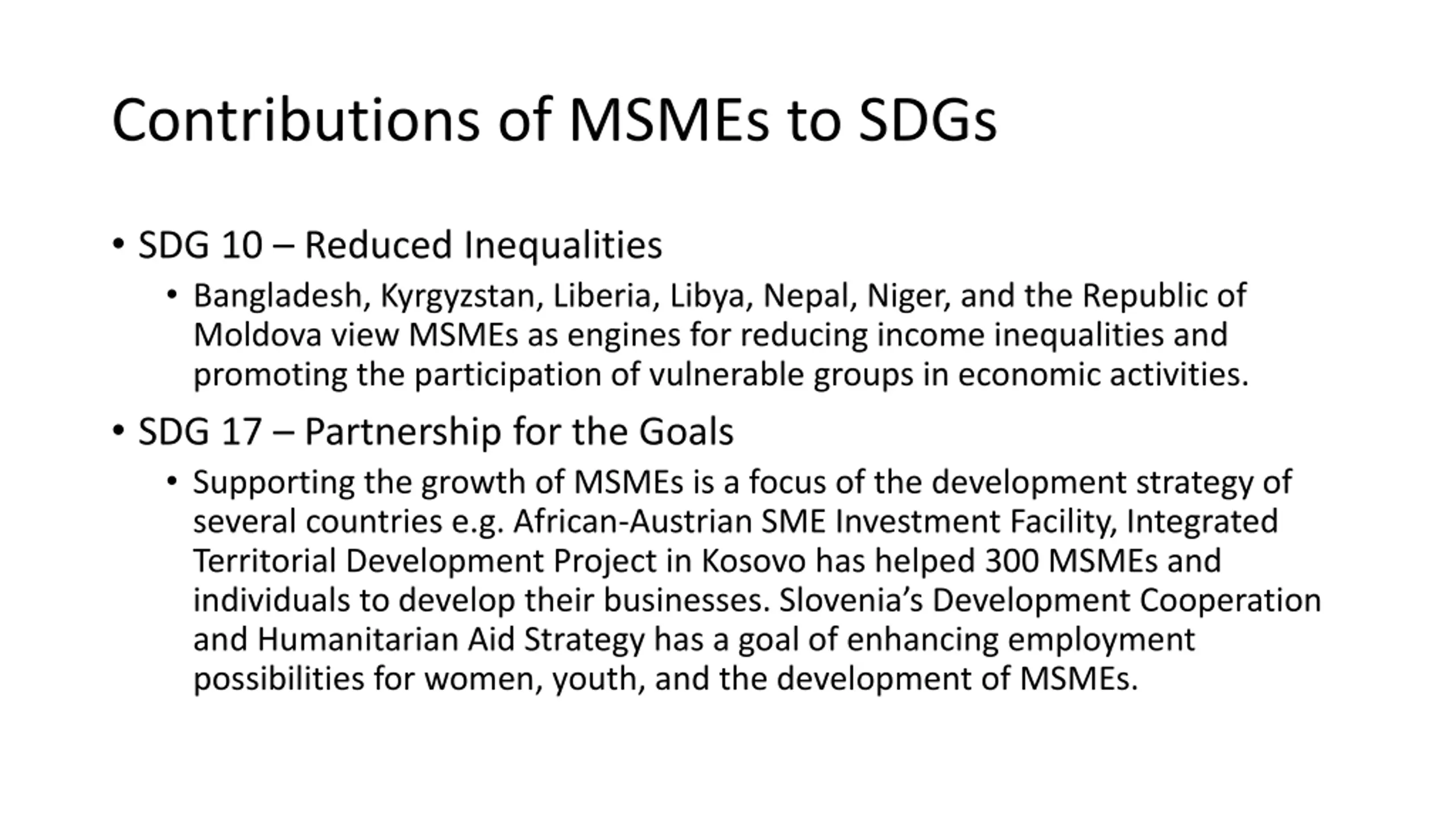 Contributions of MSMEs to SDGs SDG 10 Reduced Inequalities Bangladesh, Kyrgyzstan, Liberia, Libya, Nepal, Niger, and the Republic of Moldova view MSMEs as engines for reducing income inequalities and promoting the participation of vulnerable groups in economic activities. SDG 17 Partnership for the Goals Supporting the growth of MSMEs is a focus of the development strategy of several countries e.g. African-Austrian SME Investment Facility, Integrated Territorial Development Project in Kosovo has helped 300 MSMEs and individuals to develop their businesses. Slovenia s Development Cooperation and Humanitarian Aid Strategy has a goal of enhancing employment possibilities for women, youth, and the development of MSMEs.