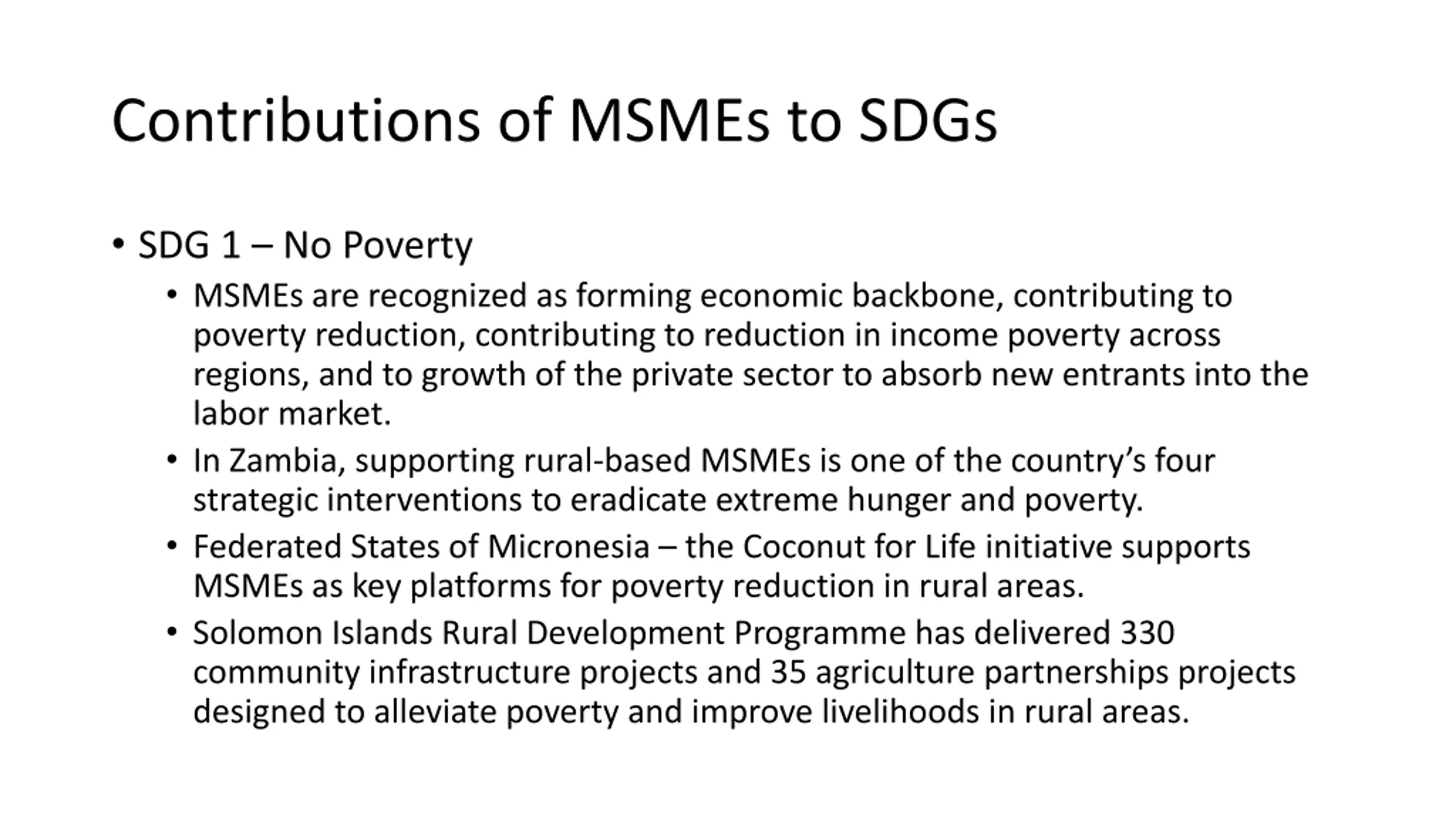 Contributions of MSMEs to SDGs SDG 1 No Poverty MSMEs are recognized as forming economic backbone, contributing to poverty reduction, contributing to reduction in income poverty across regions, and to growth of the private sector to absorb new entrants into the labor market. In Zambia, supporting rural-based MSMEs is one of the country s four strategic interventions to eradicate extreme hunger and poverty. Federated States of Micronesia the Coconut for Life initiative supports MSMEs as key platforms for poverty reduction in rural areas. Solomon Islands Rural Development Programme has delivered 330 community infrastructure projects and 35 agriculture partnerships projects designed to alleviate poverty and improve livelihoods in rural areas.