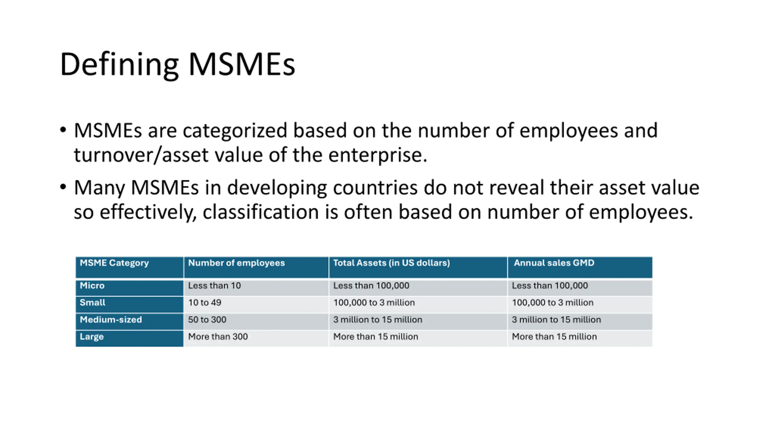Defining MSMEs MSMEs are categorized based on the number of employees and turnover/asset value of the enterprise. Many MSMEs in developing countries do not reveal their asset value so effectively, classification is often based on number of employees. MSME Category Numberof employees Total Assets (in US dollars) Annual salesGMD Micro Less than 10 Less than 100,000 Less than 100,000 Small 10 to 49 100,000 to 3million 100,000 to 3million Medium-sized 50 to 300 3 million to15 million 3 million to15 million Source: IFC 2023 Large More than 300 More than 15 million More than 15 million