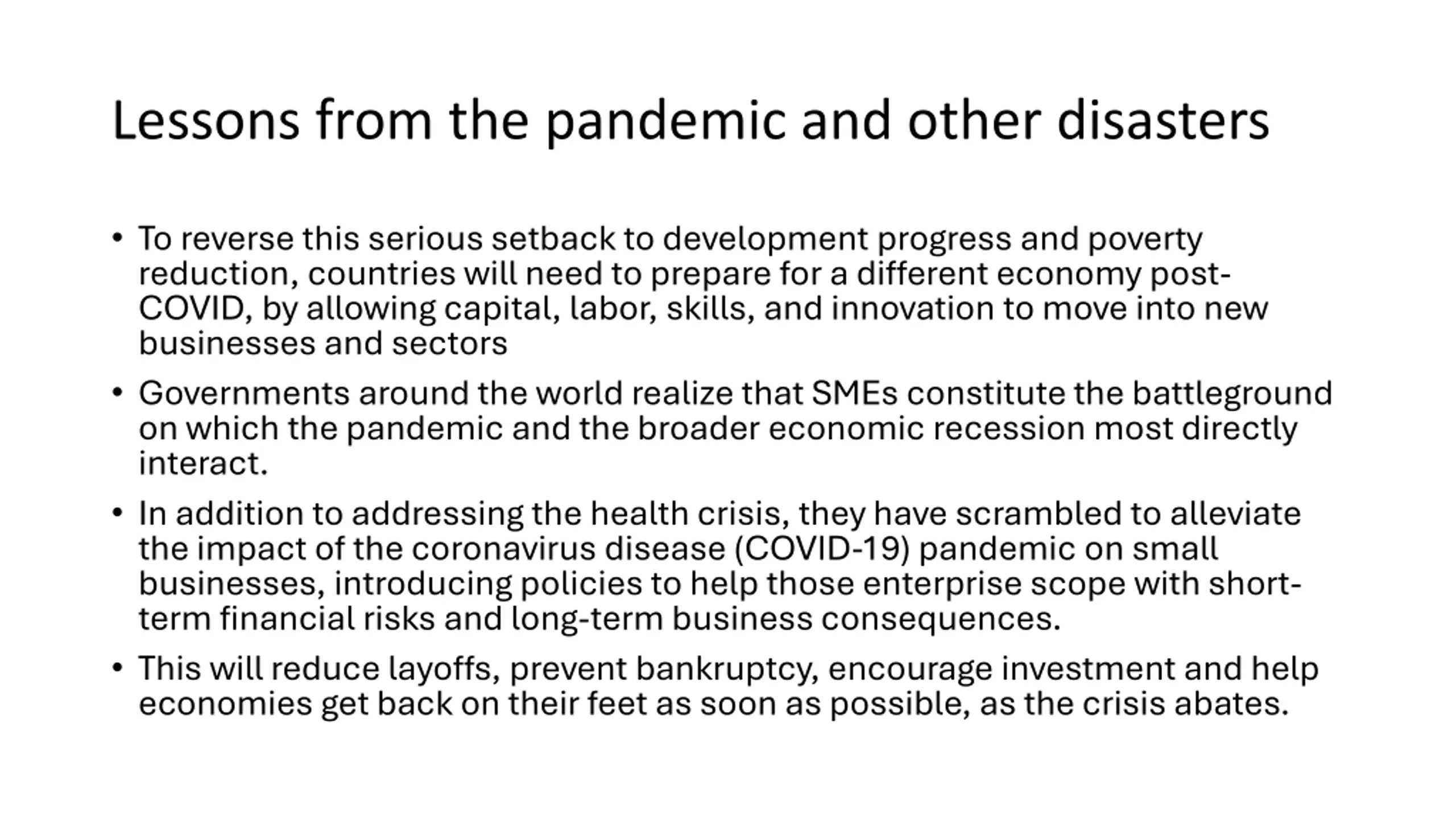 Lessons from the pandemic and other disasters To reverse this serious setback to development progress and poverty reduction, countries will need to prepare for a different economy post- COVID, by allowing capital, labor, skills, and innovation to move into new businesses and sectors Governments around the world realize that SMEs constitute the battleground on which the pandemic and the broader economic recession most directly interact. In addition to addressing the health crisis, they have scrambled to alleviate the impact of the coronavirus disease (COVID-19) pandemic on small businesses, introducing policies to help those enterprise scope with short- term financial risks and long-term business consequences. This will reduce layoffs, prevent bankruptcy, encourage investment and help economies get back on their feet as soon as possible, as the crisis abates.