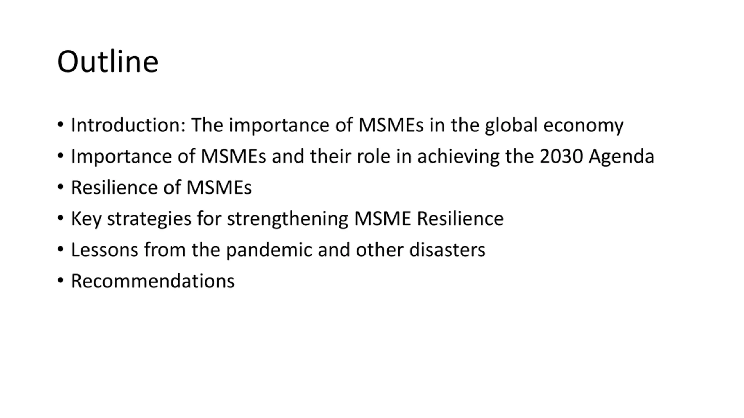 Outline Introduction: The importance of MSMEs in the global economy Importance of MSMEs and their role in achieving the 2030 Agenda Resilience of MSMEs Key strategies for strengthening MSME Resilience Lessons from the pandemic and other disasters Recommendations