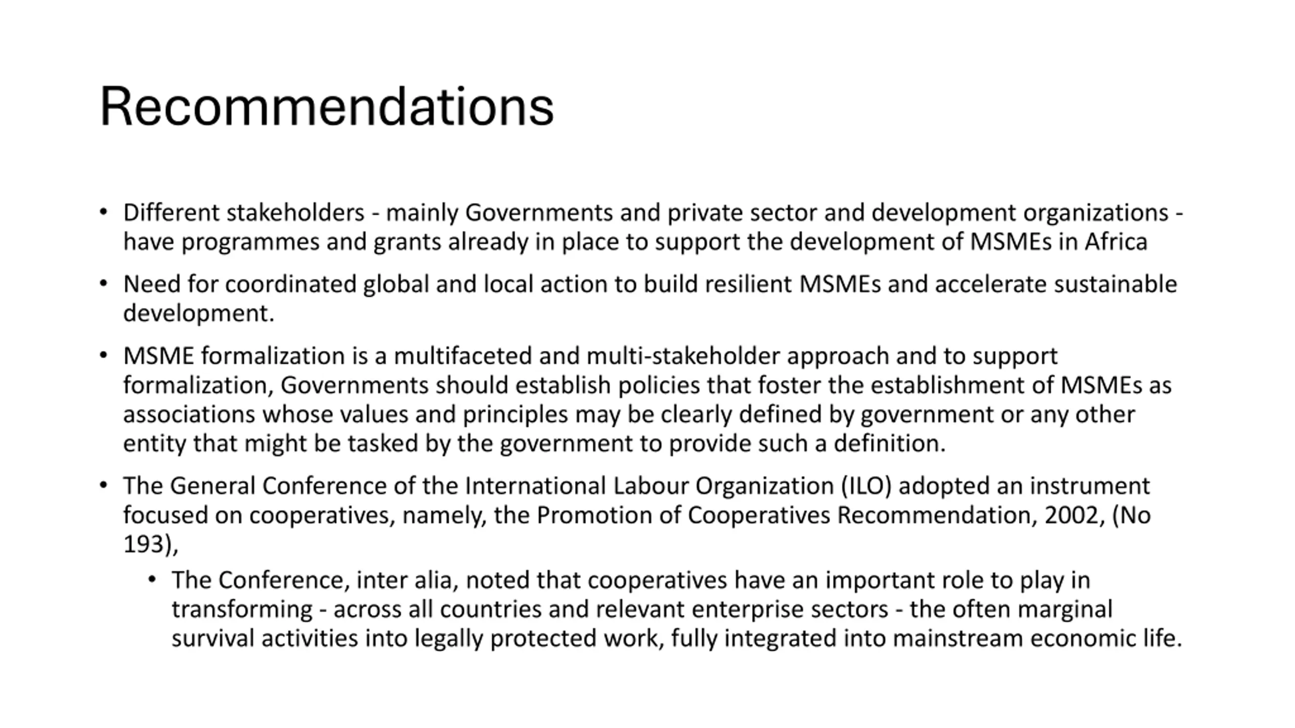 Recommendations Different stakeholders - mainly Governments and private sector and development organizations - have programmes and grants already in place to support the development of MSMEs in Africa Need for coordinated global and local action to build resilient MSMEs and accelerate sustainable development. MSME formalization is a multifaceted and multi-stakeholder approach and to support formalization, Governments should establish policies that foster the establishment of MSMEs as associations whose values and principles may be clearly defined by government or any other entity that might be tasked by the government to provide such a definition. The General Conference of the International Labour Organization (ILO) adopted an instrument focused on cooperatives, namely, the Promotion of Cooperatives Recommendation, 2002, (No 193), The Conference, inter alia, noted that cooperatives have an important role to play in transforming - across all countries and relevant enterprise sectors - the often marginal survival activities into legally protected work, fully integrated into mainstream economic life.