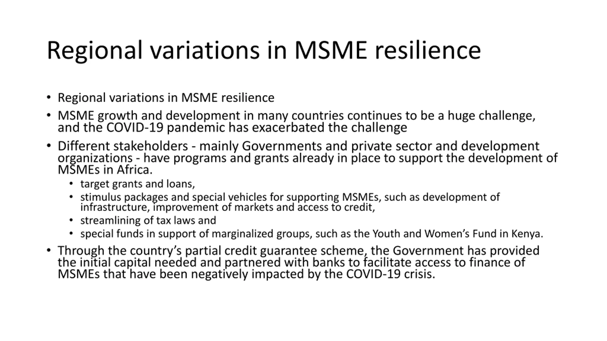 Regional variations in MSME resilience Regional variations in MSME resilience MSME growth and development in many countries continues to be a huge challenge, and the COVID-19 pandemic has exacerbated the challenge Different stakeholders - mainly Governments and private sector and development organizations - have programs and grants already in place to support the development of MSMEs in Africa. target grants and loans, stimulus packages and special vehicles for supporting MSMEs, such as development of infrastructure, improvement of markets and access to credit, streamlining of tax laws and special funds in support of marginalized groups, such as the Youth and Women s Fund in Kenya. Through the country s partial credit guarantee scheme, the Government has provided the initial capital needed and partnered with banks to facilitate access to finance of MSMEs that have been negatively impacted by the COVID-19 crisis.