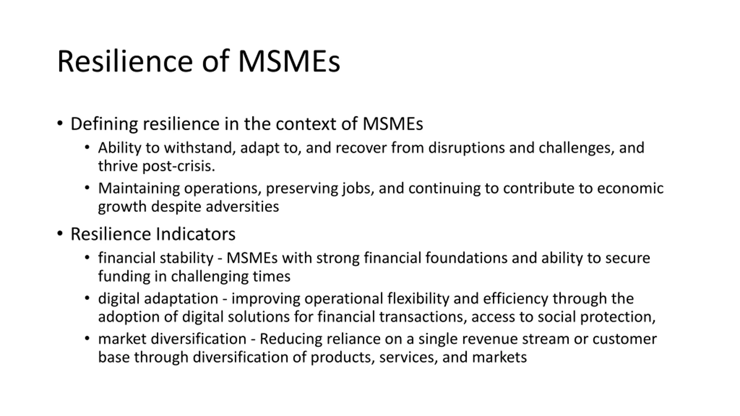 Resilience of MSMEs Defining resilience in the context of MSMEs Ability to withstand, adapt to, and recover from disruptions and challenges, and thrive post-crisis. Maintaining operations, preserving jobs, and continuing to contribute to economic growth despite adversities Resilience Indicators financial stability - MSMEs with strong financial foundations and ability to secure funding in challenging times digital adaptation - improving operational flexibility and efficiency through the adoption of digital solutions for financial transactions, access to social protection, market diversification - Reducing reliance on a single revenue stream or customer base through diversification of products, services, and markets