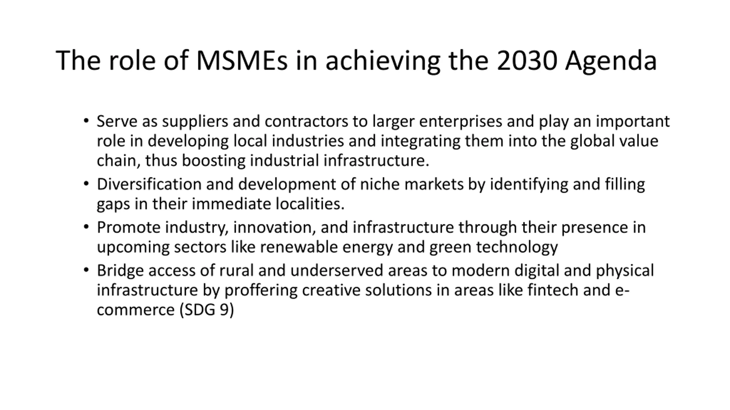 The role of MSMEs in achieving the 2030 Agenda Serve as suppliers and contractors to larger enterprises and play an important role in developing local industries and integrating them into the global value chain, thus boosting industrial infrastructure. Diversification and development of niche markets by identifying and filling gaps in their immediate localities. Promote industry, innovation, and infrastructure through their presence in upcoming sectors like renewable energy and green technology Bridge access of rural and underserved areas to modern digital and physical infrastructure by proffering creative solutions in areas like fintech and e- commerce (SDG 9)