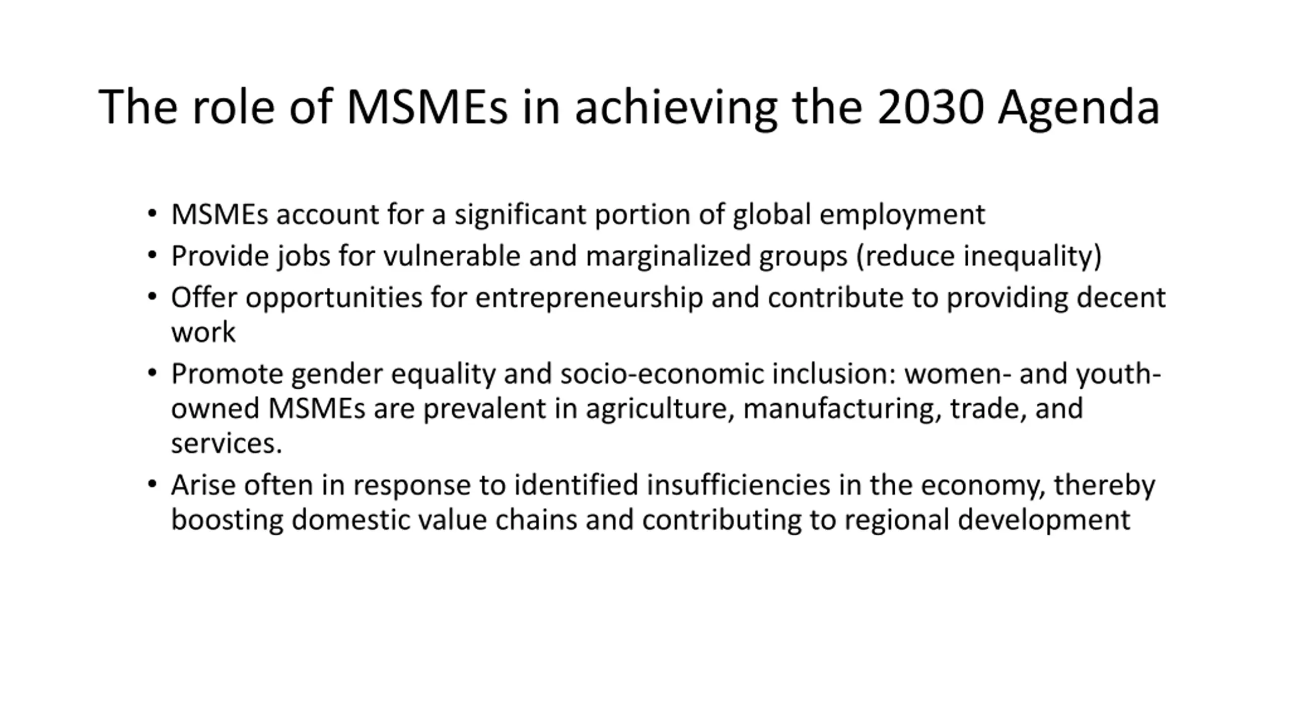 The role of MSMEs in achieving the 2030 Agenda MSMEs account for a significant portion of global employment Provide jobs for vulnerable and marginalized groups (reduce inequality) Offer opportunities for entrepreneurship and contribute to providing decent work Promote gender equality and socio-economic inclusion: women- and youth- owned MSMEs are prevalent in agriculture, manufacturing, trade, and services. Arise often in response to identified insufficiencies in the economy, thereby boosting domestic value chains and contributing to regional development