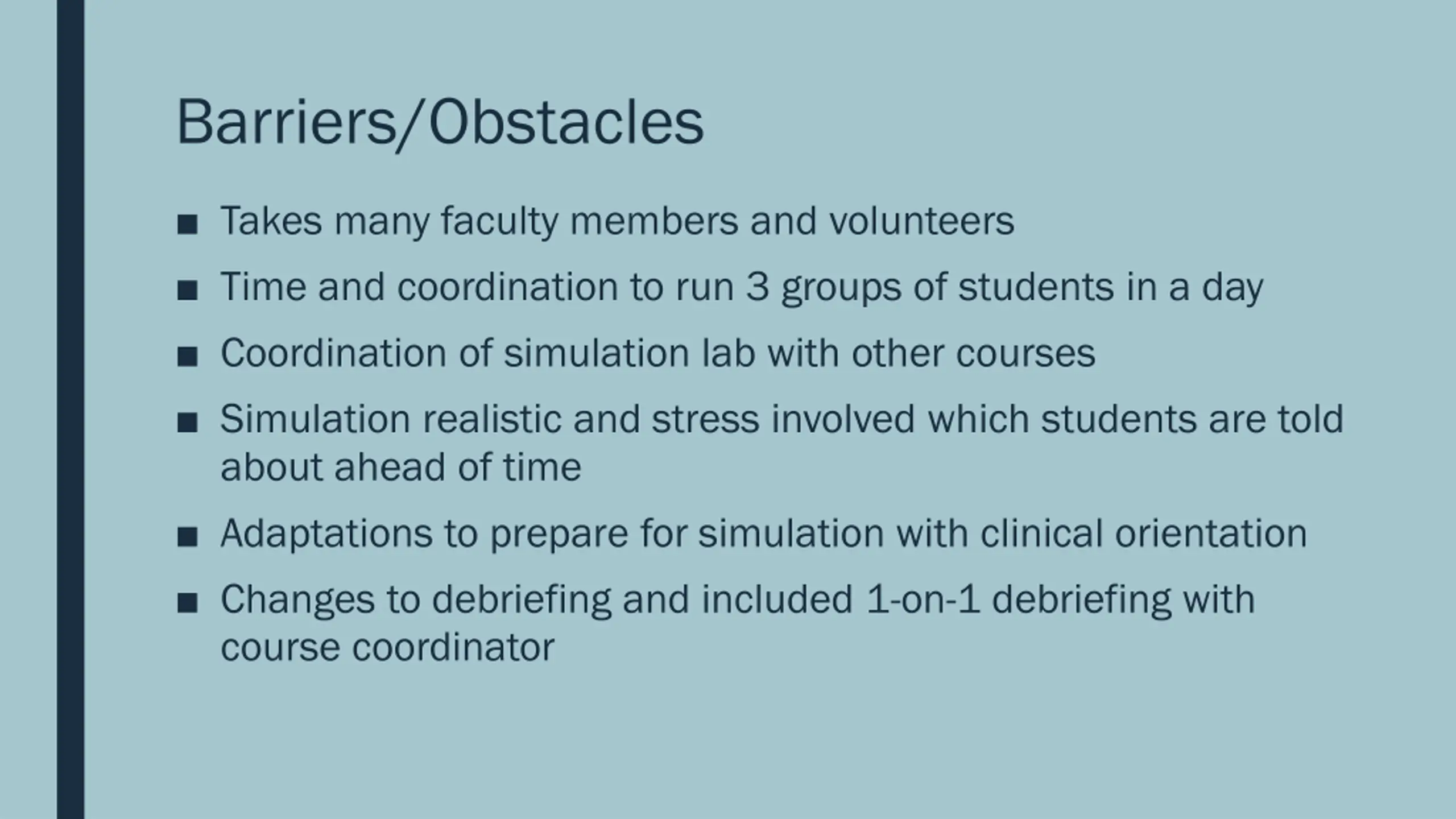 Barriers/Obstacles Takes many faculty members and volunteers Time and coordination to run 3 groups of students in a day Coordination of simulation lab with other courses Simulation realistic and stress involved which students are told about ahead of time Adaptations to prepare for simulation with clinical orientation Changes to debriefing and included 1-on-1 debriefing with course coordinator