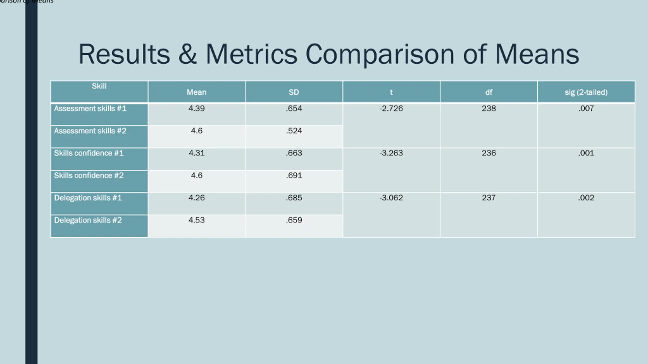 Comparison of Means Results & Metrics Comparison of Means Skill Skill Mean Mean SD SD t t df df sig (2 sig (2- -tailed) tailed) Assessment skills #1 Assessment skills #1 4.39 .654 -2.726 238 .007 Assessment skills #2 Assessment skills #2 4.6 .524 Skills confidence #1 Skills confidence #1 4.31 .663 -3.263 236 .001 Skills confidence #2 Skills confidence #2 4.6 .691 Delegation skills #1 Delegation skills #1 4.26 .685 -3.062 237 .002 Delegation skills #2 Delegation skills #2 4.53 .659