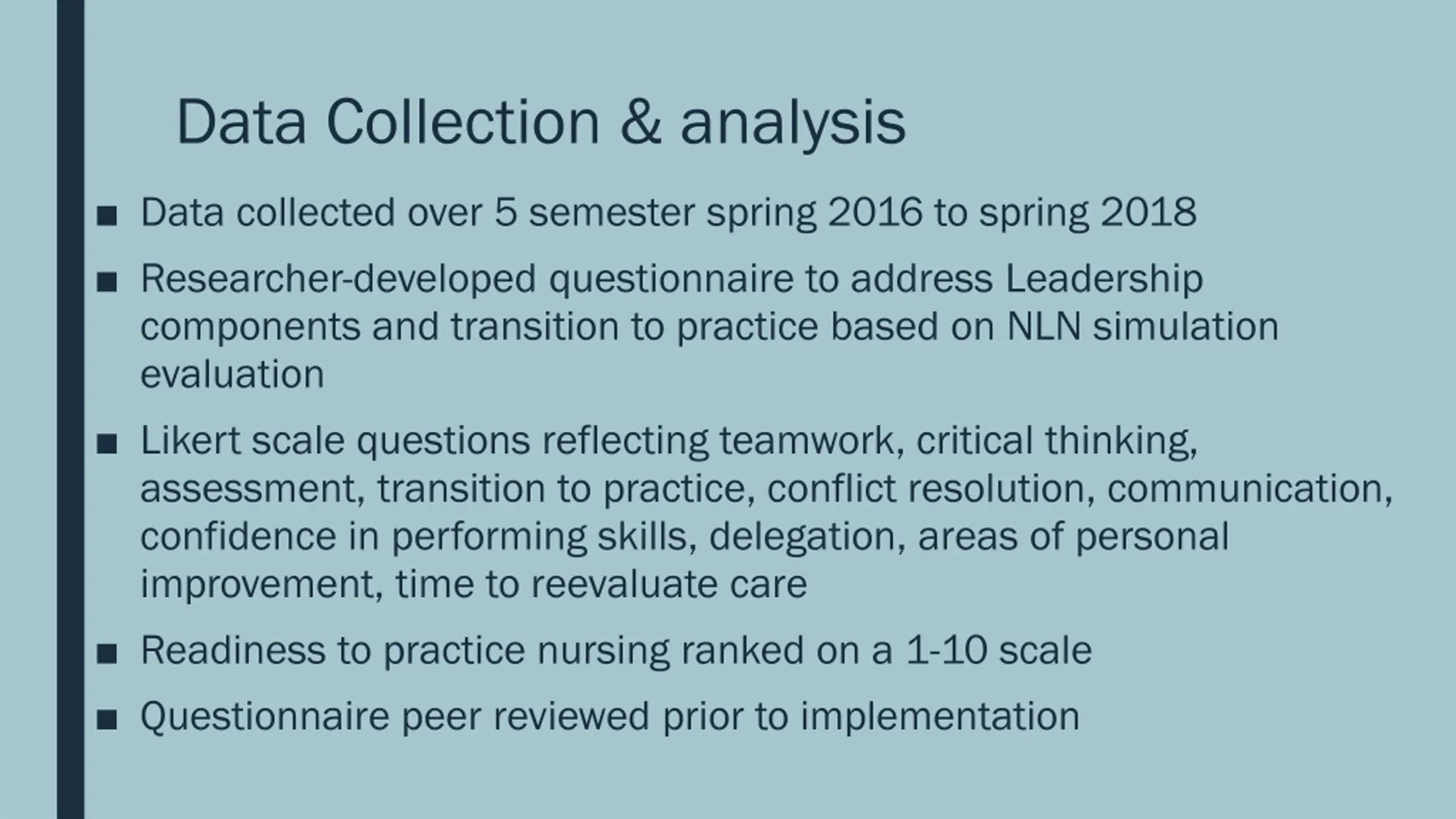 Data Collection & analysis Data collected over 5 semester spring 2016 to spring 2018 Researcher-developed questionnaire to address Leadership components and transition to practice based on NLN simulation evaluation Likert scale questions reflecting teamwork, critical thinking, assessment, transition to practice, conflict resolution, communication, confidence in performing skills, delegation, areas of personal improvement, time to reevaluate care Readiness to practice nursing ranked on a 1-10 scale Questionnaire peer reviewed prior to implementation