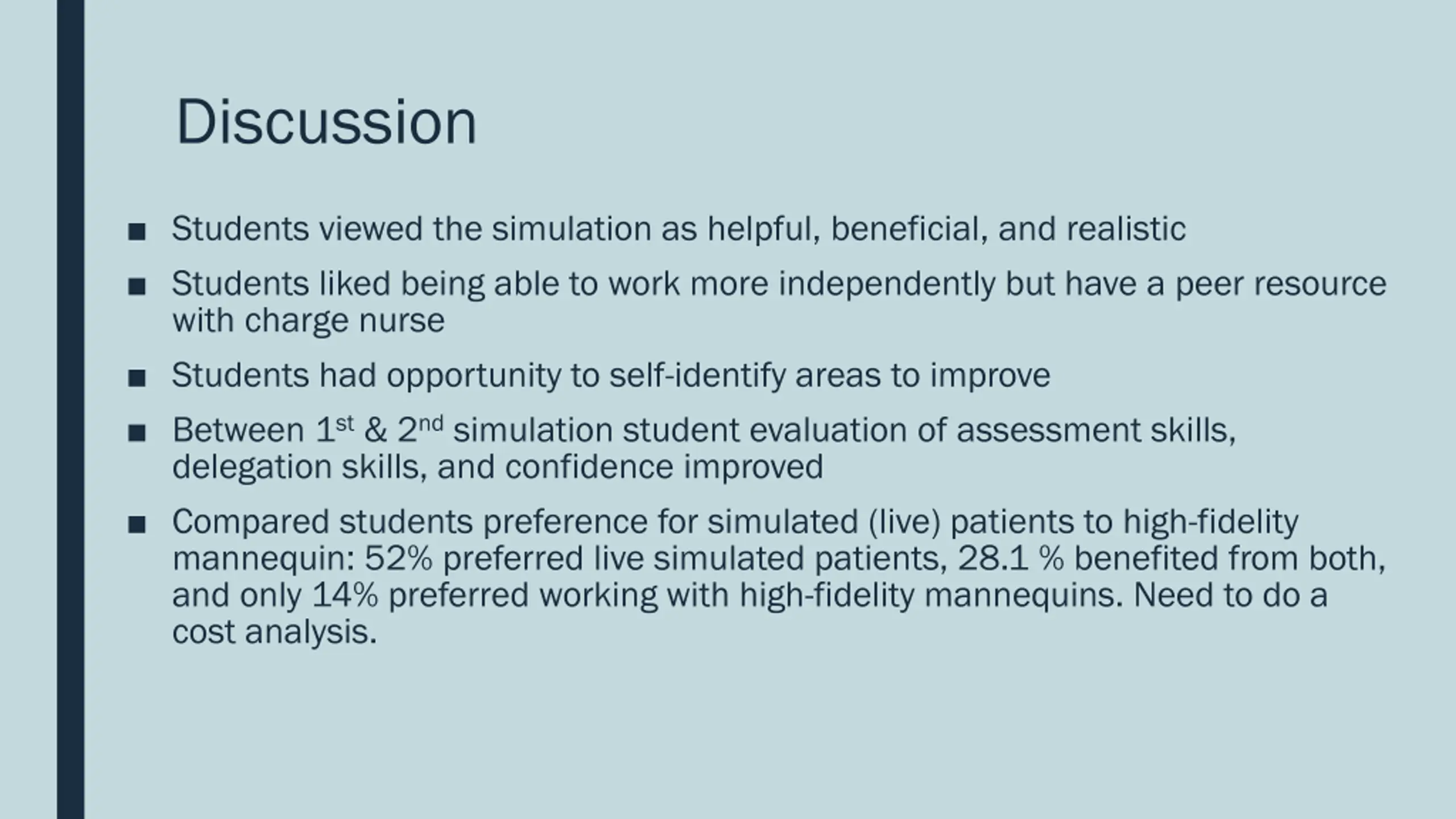 Discussion Students viewed the simulation as helpful, beneficial, and realistic Students liked being able to work more independently but have a peer resource with charge nurse Students had opportunity to self-identify areas to improve Between 1st & 2nd simulation student evaluation of assessment skills, delegation skills, and confidence improved Compared students preference for simulated (live) patients to high-fidelity mannequin: 52% preferred live simulated patients, 28.1 % benefited from both, and only 14% preferred working with high-fidelity mannequins. Need to do a cost analysis.