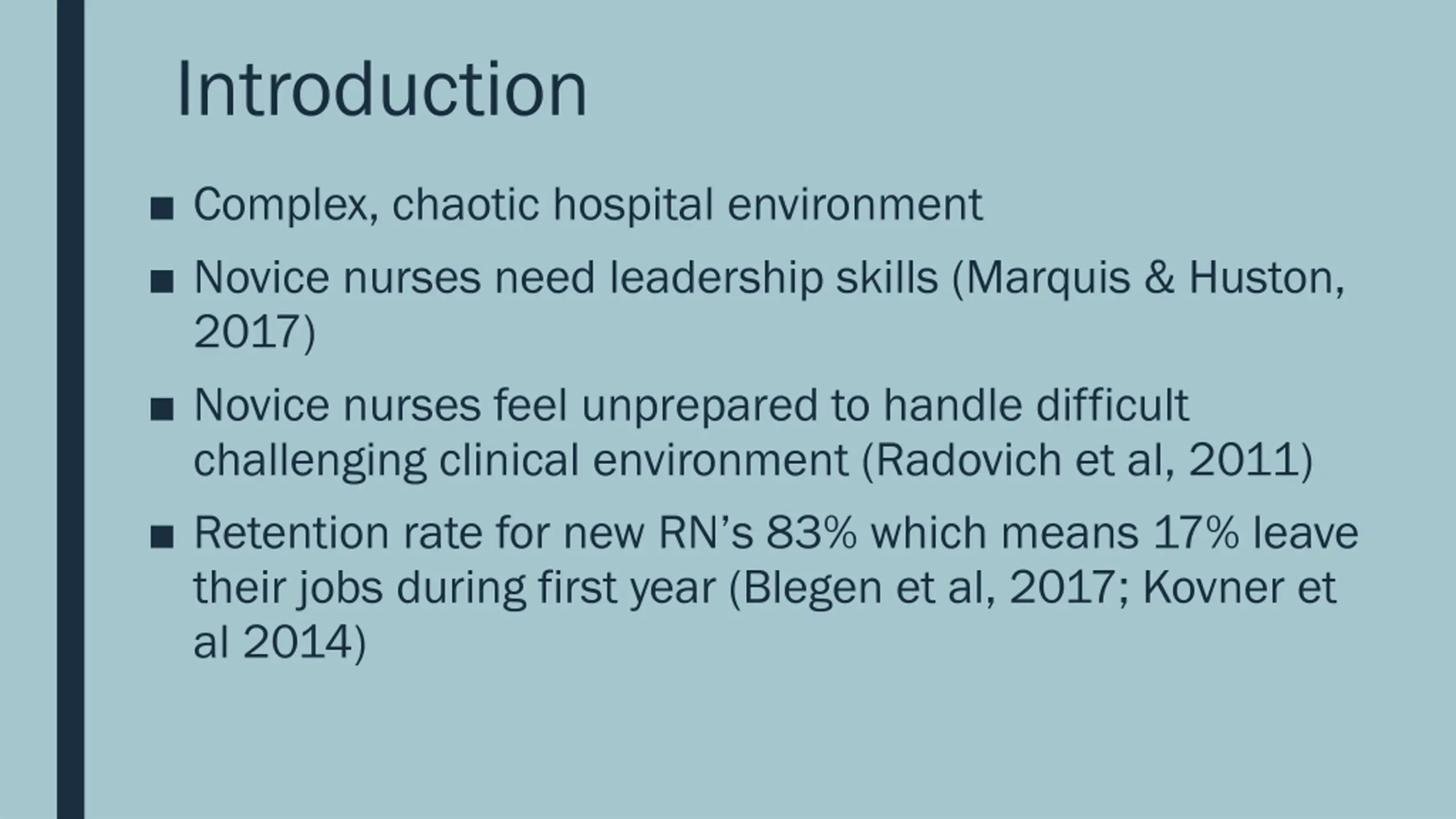Introduction Complex, chaotic hospital environment Novice nurses need leadership skills (Marquis & Huston, 2017) Novice nurses feel unprepared to handle difficult challenging clinical environment (Radovich et al, 2011) Retention rate for new RN s 83% which means 17% leave their jobs during first year (Blegen et al, 2017; Kovner et al 2014)