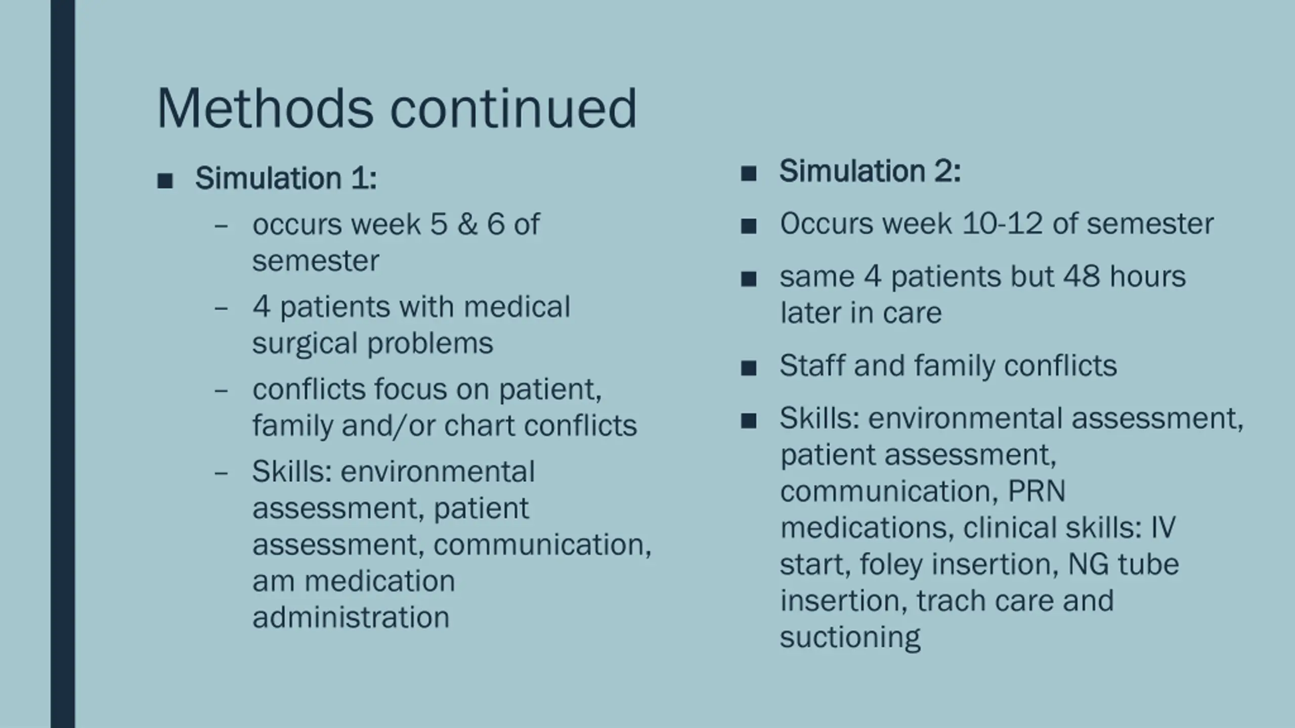 Methods continued Simulation 2: Simulation 2: Occurs week 10-12 of semester same 4 patients but 48 hours later in care Staff and family conflicts Skills: environmental assessment, patient assessment, communication, PRN medications, clinical skills: IV start, foley insertion, NG tube insertion, trach care and suctioning Simulation 1: Simulation 1: occurs week 5 & 6 of semester 4 patients with medical surgical problems conflicts focus on patient, family and/or chart conflicts Skills: environmental assessment, patient assessment, communication, am medication administration