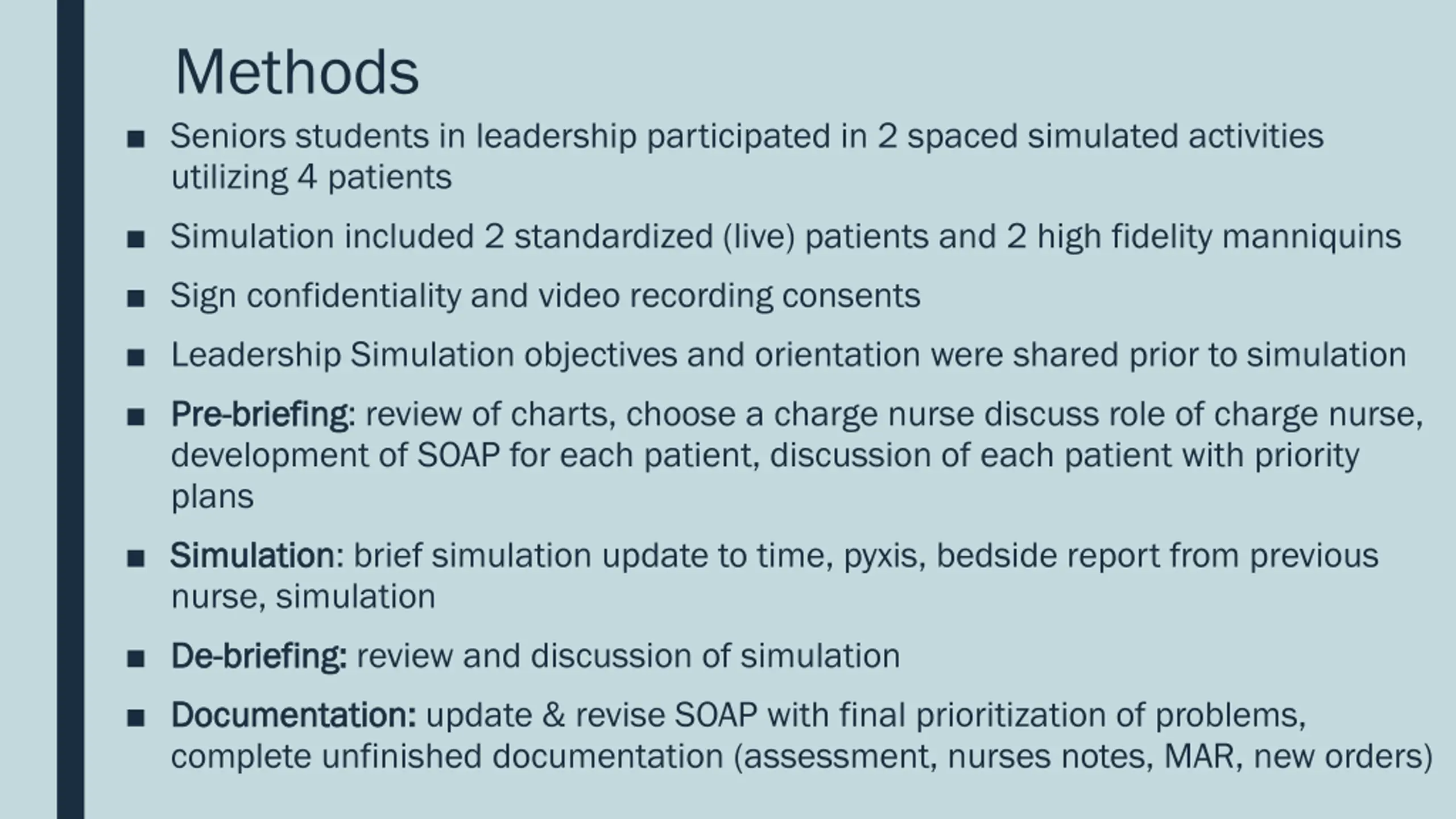 Methods Seniors students in leadership participated in 2 spaced simulated activities utilizing 4 patients Simulation included 2 standardized (live) patients and 2 high fidelity manniquins Sign confidentiality and video recording consents Leadership Simulation objectives and orientation were shared prior to simulation Pre Pre- -briefing briefing: review of charts, choose a charge nurse discuss role of charge nurse, development of SOAP for each patient, discussion of each patient with priority plans Simulation Simulation: brief simulation update to time, pyxis, bedside report from previous nurse, simulation De De- -briefing: briefing: review and discussion of simulation Documentation: Documentation: update & revise SOAP with final prioritization of problems, complete unfinished documentation (assessment, nurses notes, MAR, new orders)