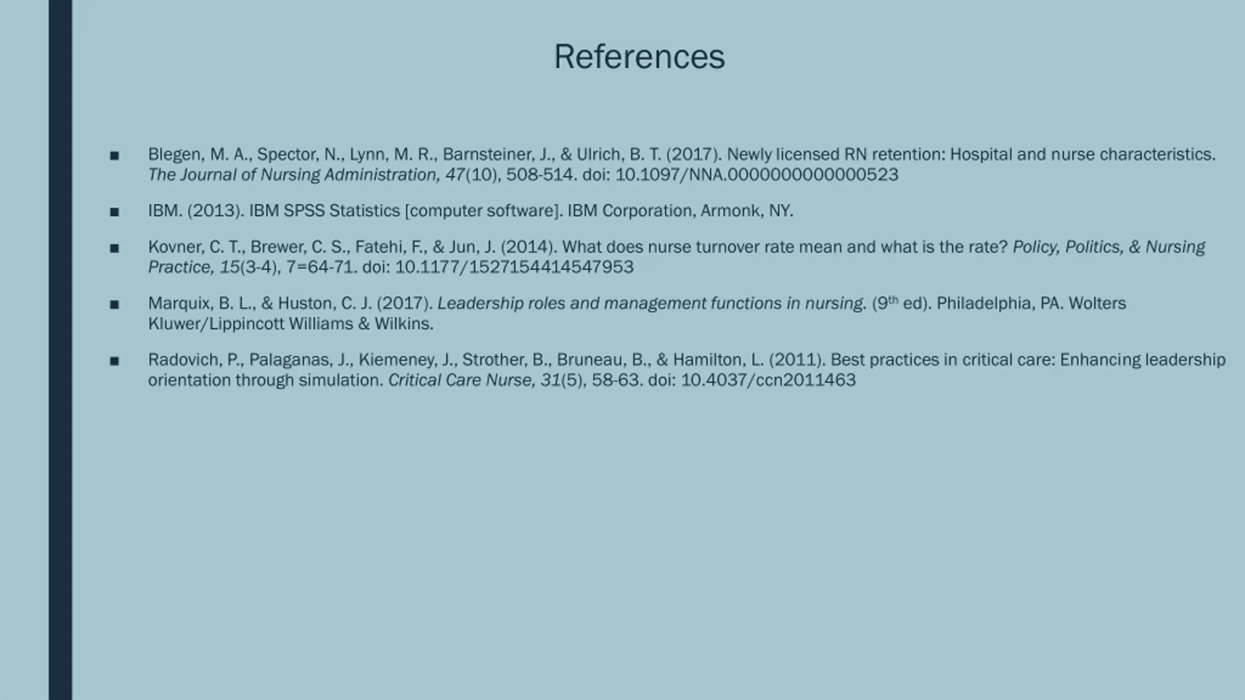 References Blegen, M. A., Spector, N., Lynn, M. R., Barnsteiner, J., & Ulrich, B. T. (2017). Newly licensed RN retention: Hospital and nurse characteristics. The Journal of Nursing Administration, 47(10), 508-514. doi: 10.1097/NNA.0000000000000523 IBM. (2013). IBM SPSS Statistics [computer software]. IBM Corporation, Armonk, NY. Kovner, C. T., Brewer, C. S., Fatehi, F., & Jun, J. (2014). What does nurse turnover rate mean and what is the rate? Policy, Politics, & Nursing Practice, 15(3-4), 7=64-71. doi: 10.1177/1527154414547953 Marquix, B. L., & Huston, C. J. (2017). Leadership roles and management functions in nursing. (9th ed). Philadelphia, PA. Wolters Kluwer/Lippincott Williams & Wilkins. Radovich, P., Palaganas, J., Kiemeney, J., Strother, B., Bruneau, B., & Hamilton, L. (2011). Best practices in critical care: Enhancing leadership orientation through simulation. Critical Care Nurse, 31(5), 58-63. doi: 10.4037/ccn2011463