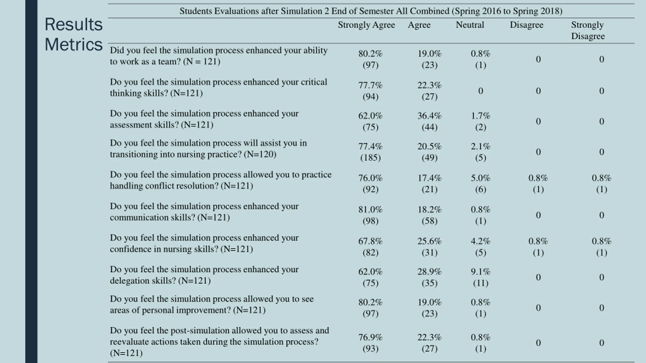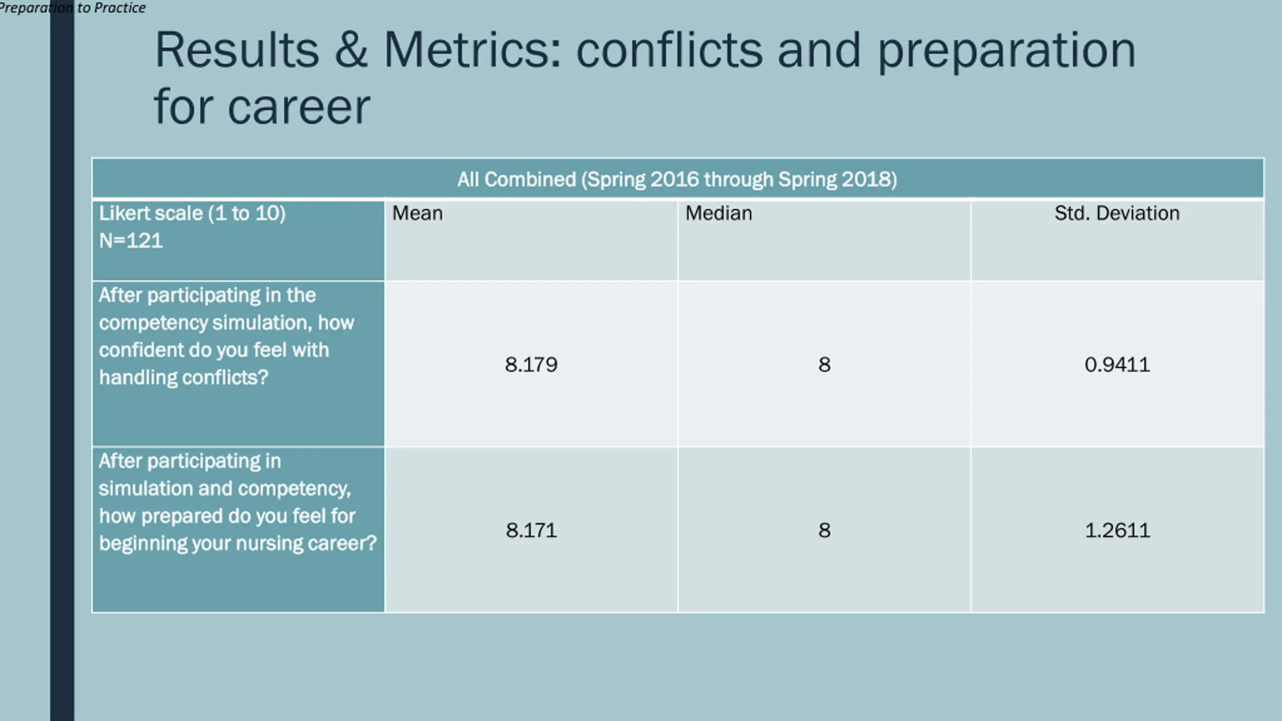 Student Preparation to Practice Results & Metrics: conflicts and preparation for career All Combined (Spring 2016 through Spring 2018) All Combined (Spring 2016 through Spring 2018) Likert scale (1 to 10) Likert scale (1 to 10) N=121 N=121 Mean Median Std. Deviation After participating in the After participating in the competency simulation, how competency simulation, how confident do you feel with confident do you feel with handling conflicts? handling conflicts? 8.179 8 0.9411 After participating in After participating in simulation and competency, simulation and competency, how prepared do you feel for how prepared do you feel for beginning your nursing career? beginning your nursing career? 8.171 8 1.2611