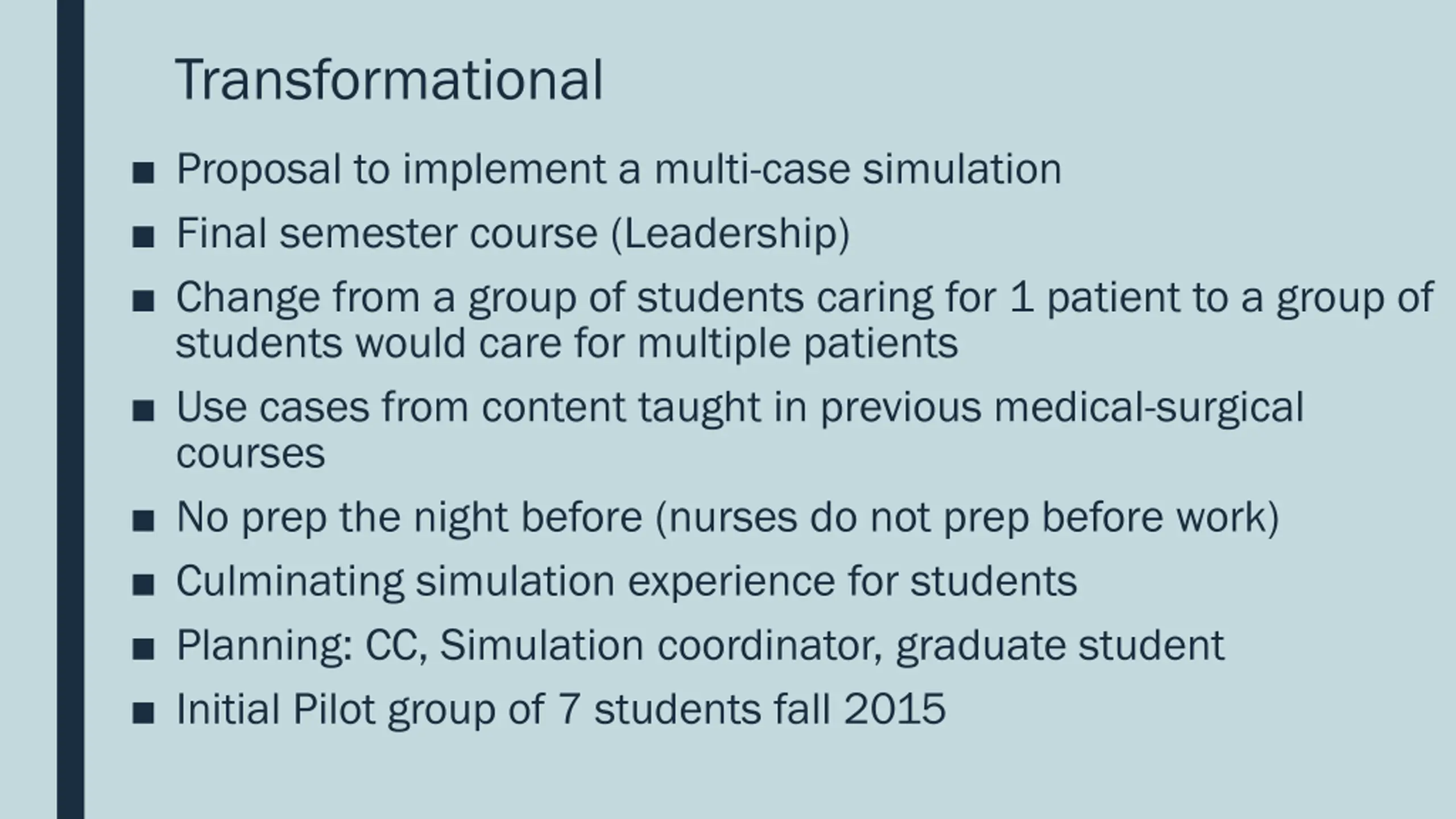 Transformational Proposal to implement a multi-case simulation Final semester course (Leadership) Change from a group of students caring for 1 patient to a group of students would care for multiple patients Use cases from content taught in previous medical-surgical courses No prep the night before (nurses do not prep before work) Culminating simulation experience for students Planning: CC, Simulation coordinator, graduate student Initial Pilot group of 7 students fall 2015