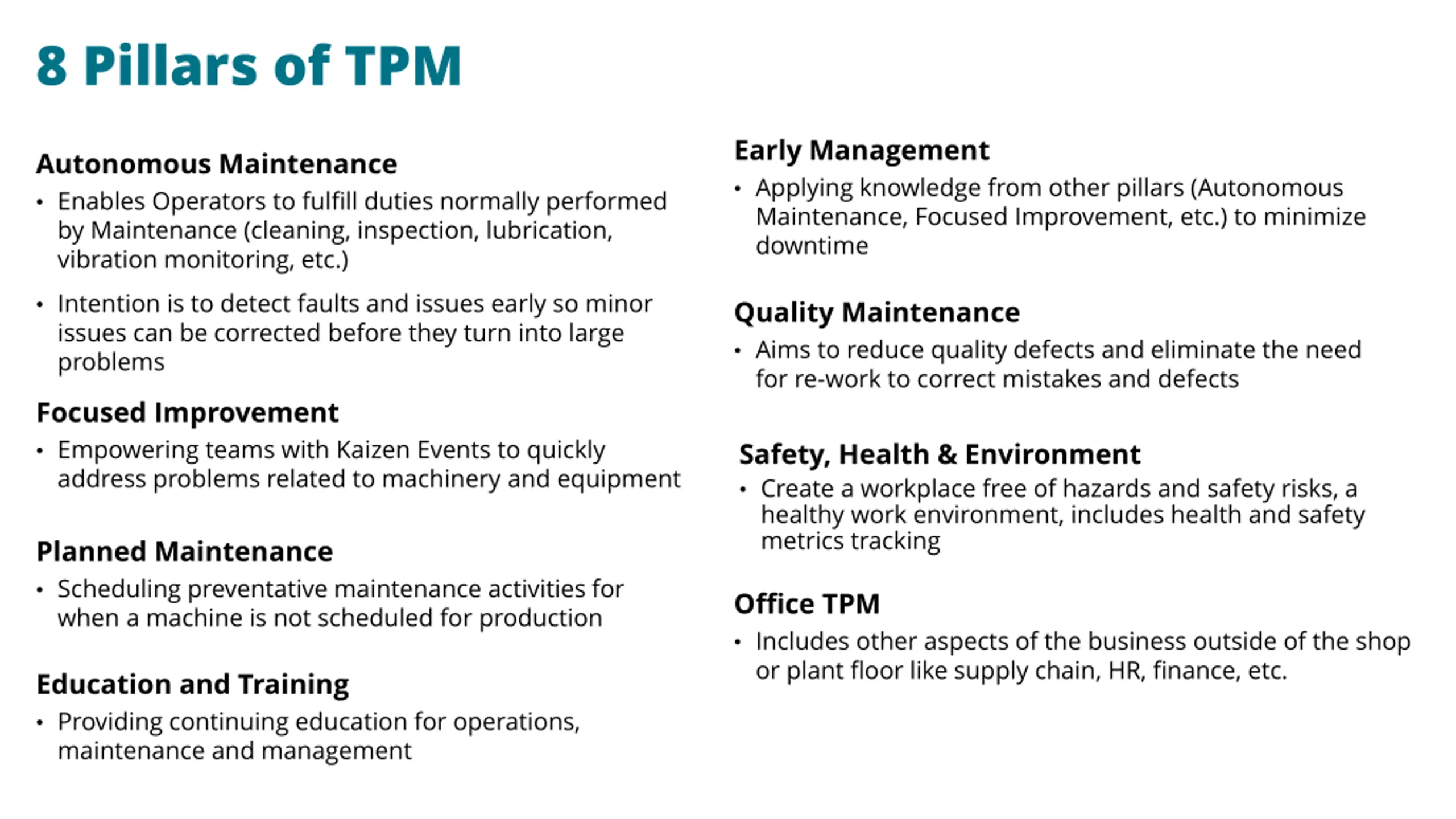 8 Pillars of TPM Early Management Applying knowledge from other pillars (Autonomous Maintenance, Focused Improvement, etc.) to minimize downtime Autonomous Maintenance Enables Operators to fulfill duties normally performed by Maintenance (cleaning, inspection, lubrication, vibration monitoring, etc.) Intention is to detect faults and issues early so minor issues can be corrected before they turn into large problems Quality Maintenance Aims to reduce quality defects and eliminate the need for re-work to correct mistakes and defects Focused Improvement Empowering teams with Kaizen Events to quickly address problems related to machinery and equipment Safety, Health & Environment Create a workplace free of hazards and safety risks, a healthy work environment, includes health and safety metrics tracking Planned Maintenance Scheduling preventative maintenance activities for when a machine is not scheduled for production Office TPM Includes other aspects of the business outside of the shop or plant floor like supply chain, HR, finance, etc. Education and Training Providing continuing education for operations, maintenance and management