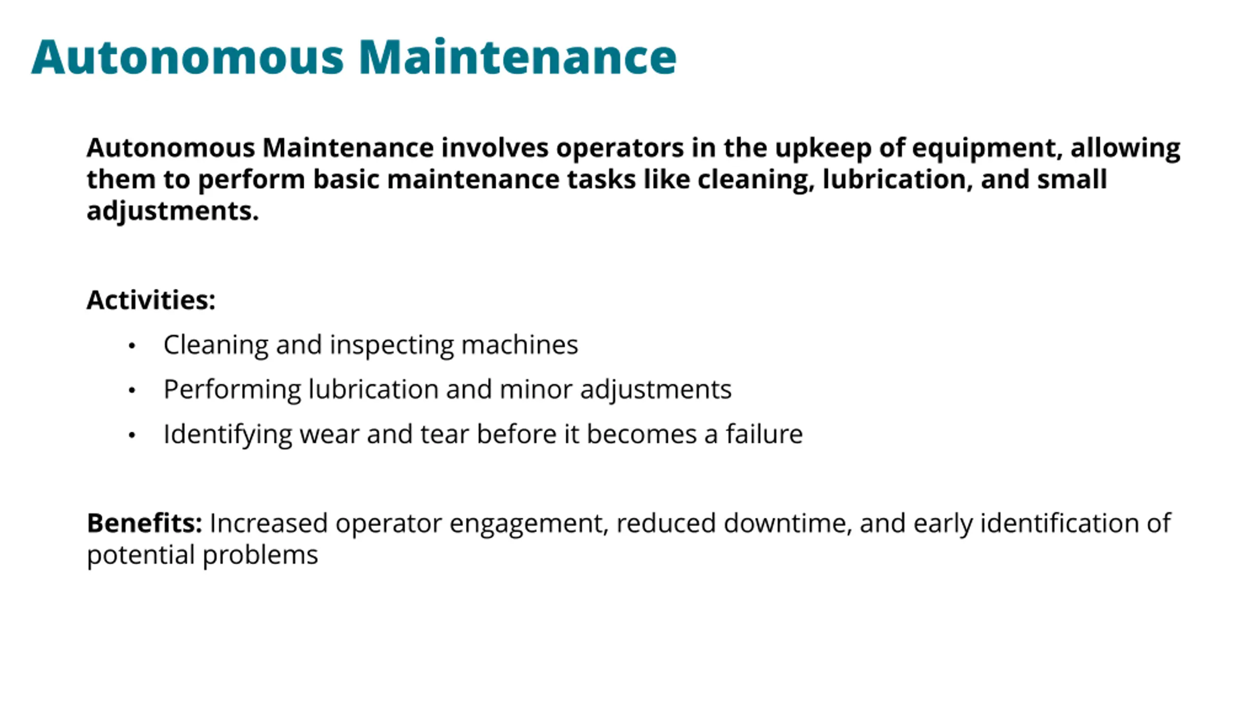 Autonomous Maintenance Autonomous Maintenance involves operators in the upkeep of equipment, allowing them to perform basic maintenance tasks like cleaning, lubrication, and small adjustments. Activities: Cleaning and inspecting machines Performing lubrication and minor adjustments Identifying wear and tear before it becomes a failure Benefits: Increased operator engagement, reduced downtime, and early identification of potential problems