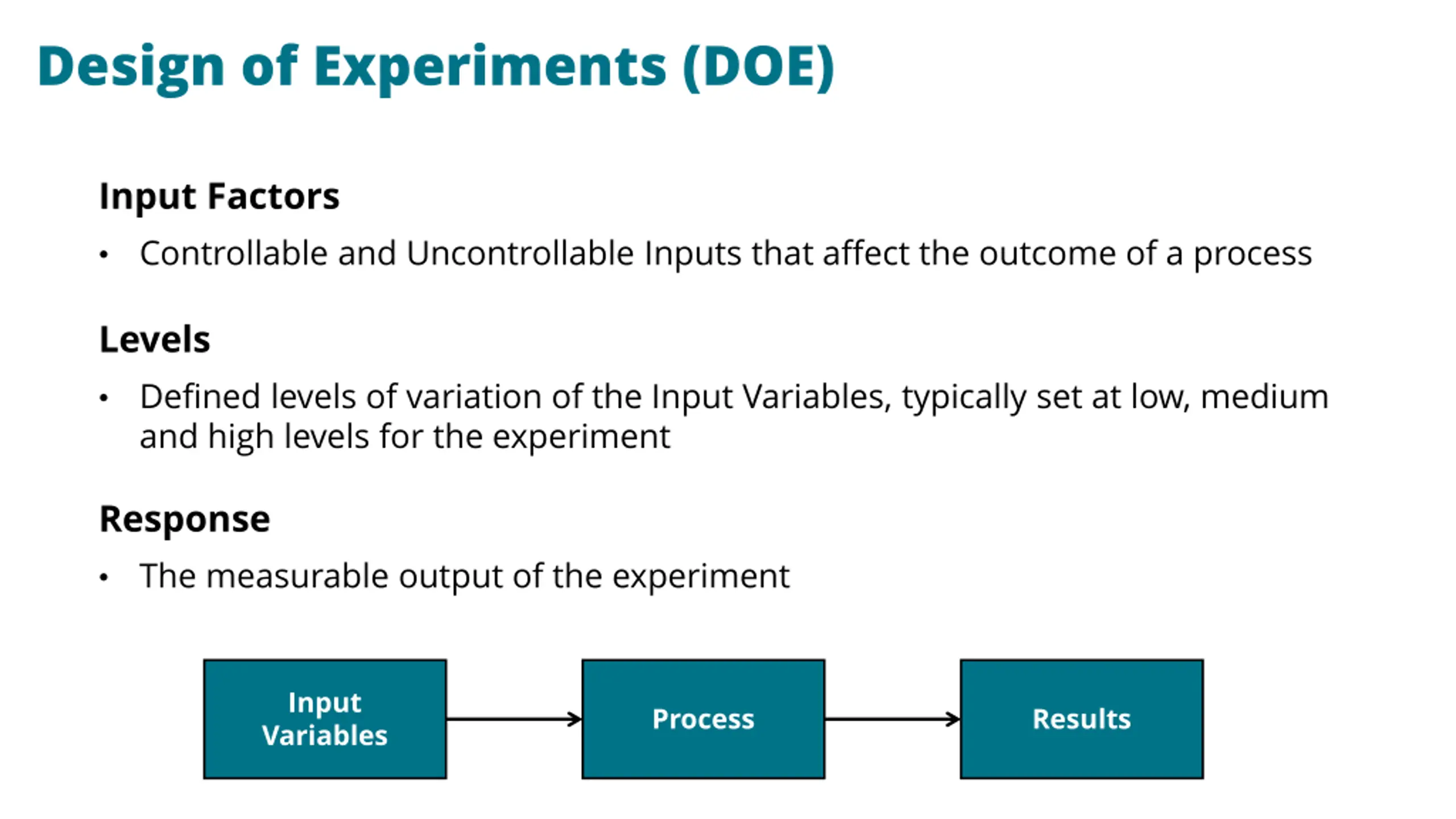 Design of Experiments (DOE) Input Factors Controllable and Uncontrollable Inputs that affect the outcome of a process Levels Defined levels of variation of the Input Variables, typically set at low, medium and high levels for the experiment Response The measurable output of the experiment Input Variables Process Results