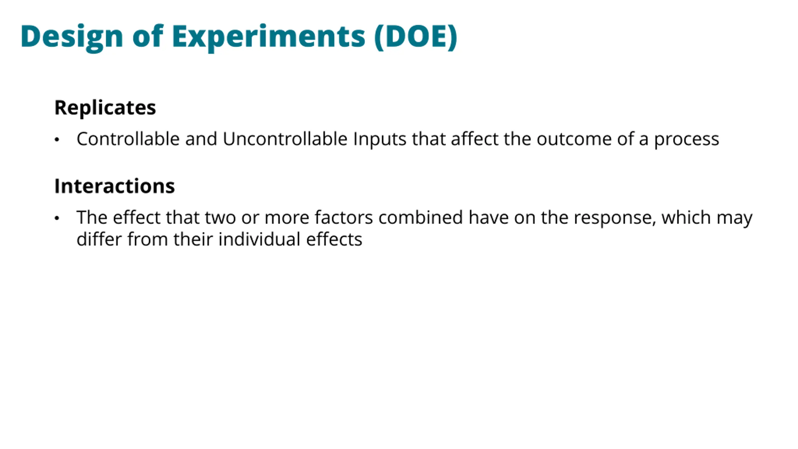 Design of Experiments (DOE) Replicates Controllable and Uncontrollable Inputs that affect the outcome of a process Interactions The effect that two or more factors combined have on the response, which may differ from their individual effects