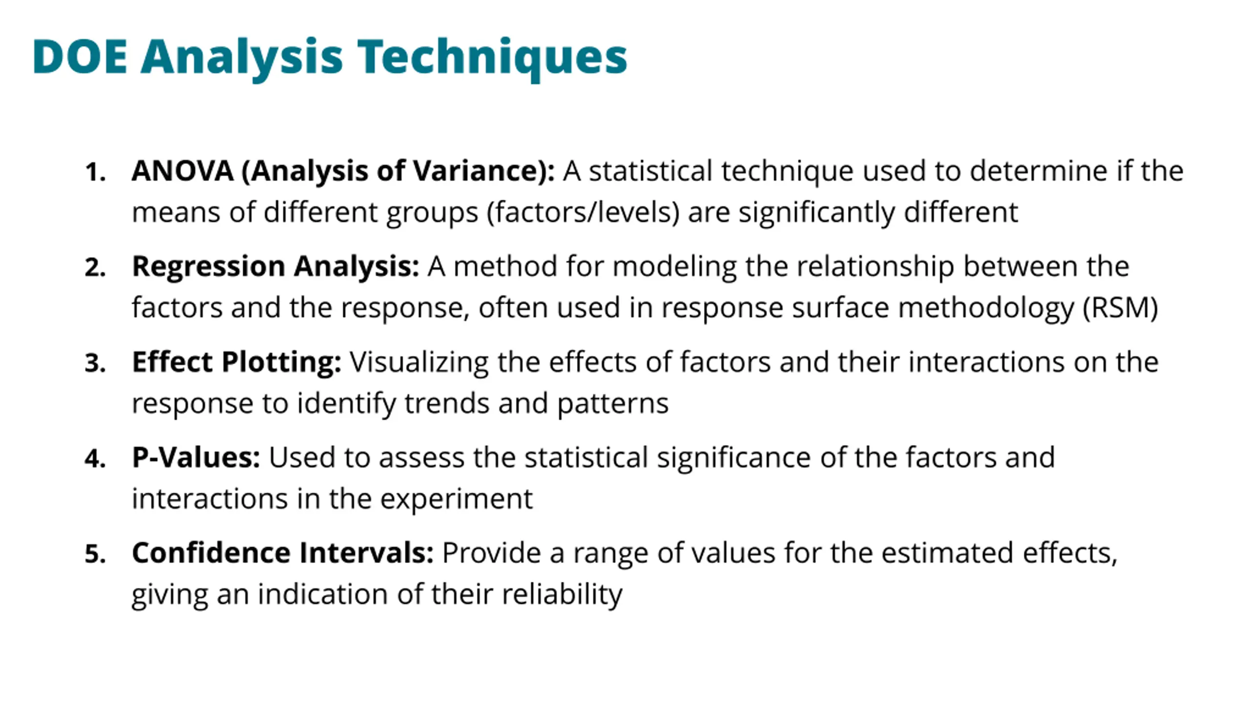 DOE Analysis Techniques 1. ANOVA (Analysis of Variance): A statistical technique used to determine if the means of different groups (factors/levels) are significantly different 2. Regression Analysis: A method for modeling the relationship between the factors and the response, often used in response surface methodology (RSM) 3. Effect Plotting: Visualizing the effects of factors and their interactions on the response to identify trends and patterns 4. P-Values: Used to assess the statistical significance of the factors and interactions in the experiment 5. Confidence Intervals: Provide a range of values for the estimated effects, giving an indication of their reliability
