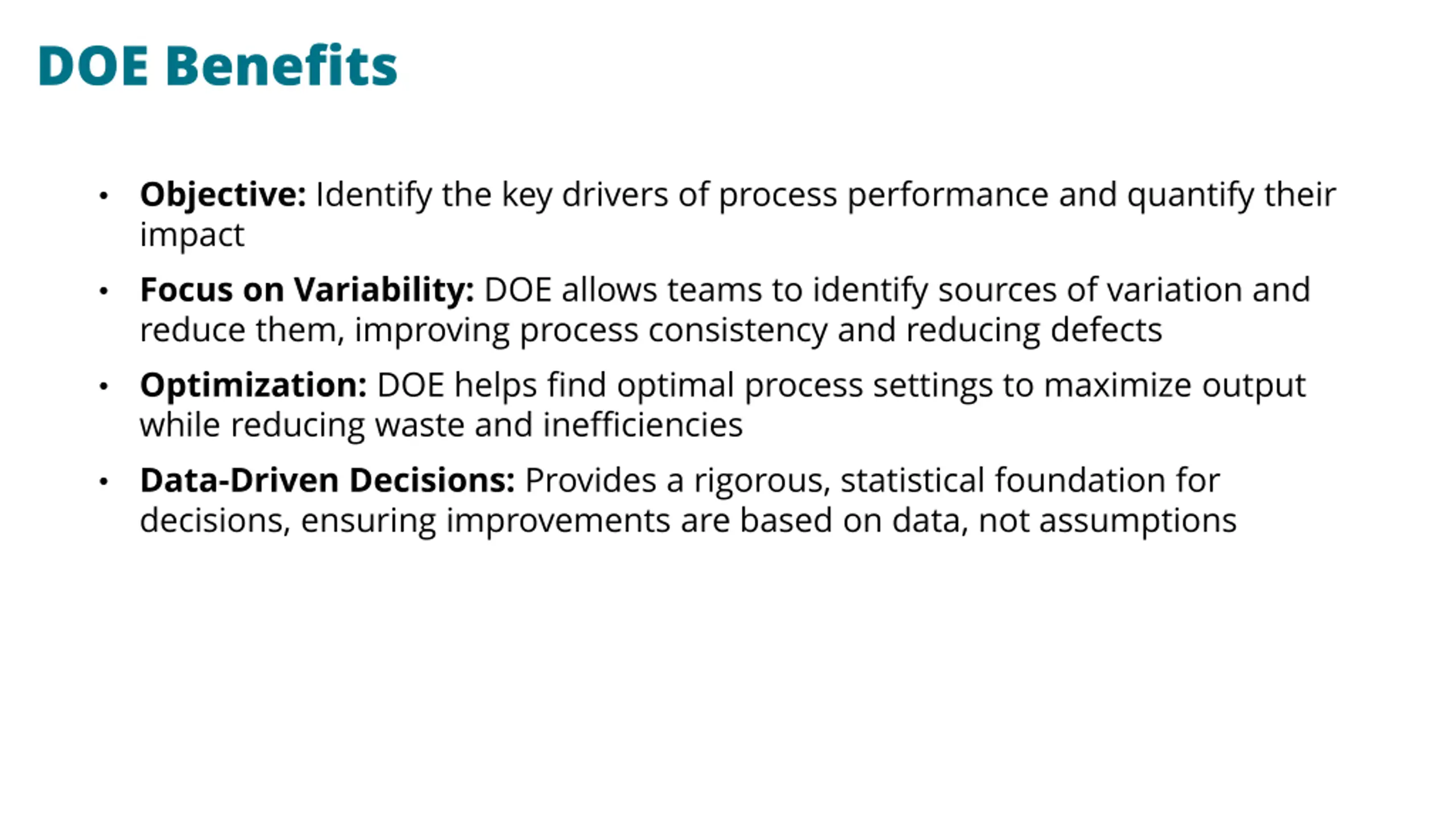 DOE Benefits Objective: Identify the key drivers of process performance and quantify their impact Focus on Variability: DOE allows teams to identify sources of variation and reduce them, improving process consistency and reducing defects Optimization: DOE helps find optimal process settings to maximize output while reducing waste and inefficiencies Data-Driven Decisions: Provides a rigorous, statistical foundation for decisions, ensuring improvements are based on data, not assumptions