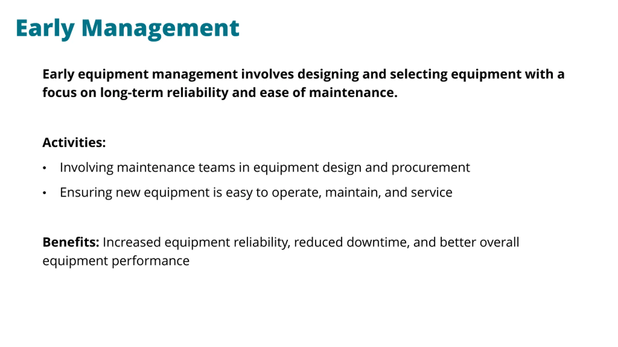 Early Management Early equipment management involves designing and selecting equipment with a focus on long-term reliability and ease of maintenance. Activities: Involving maintenance teams in equipment design and procurement Ensuring new equipment is easy to operate, maintain, and service Benefits: Increased equipment reliability, reduced downtime, and better overall equipment performance