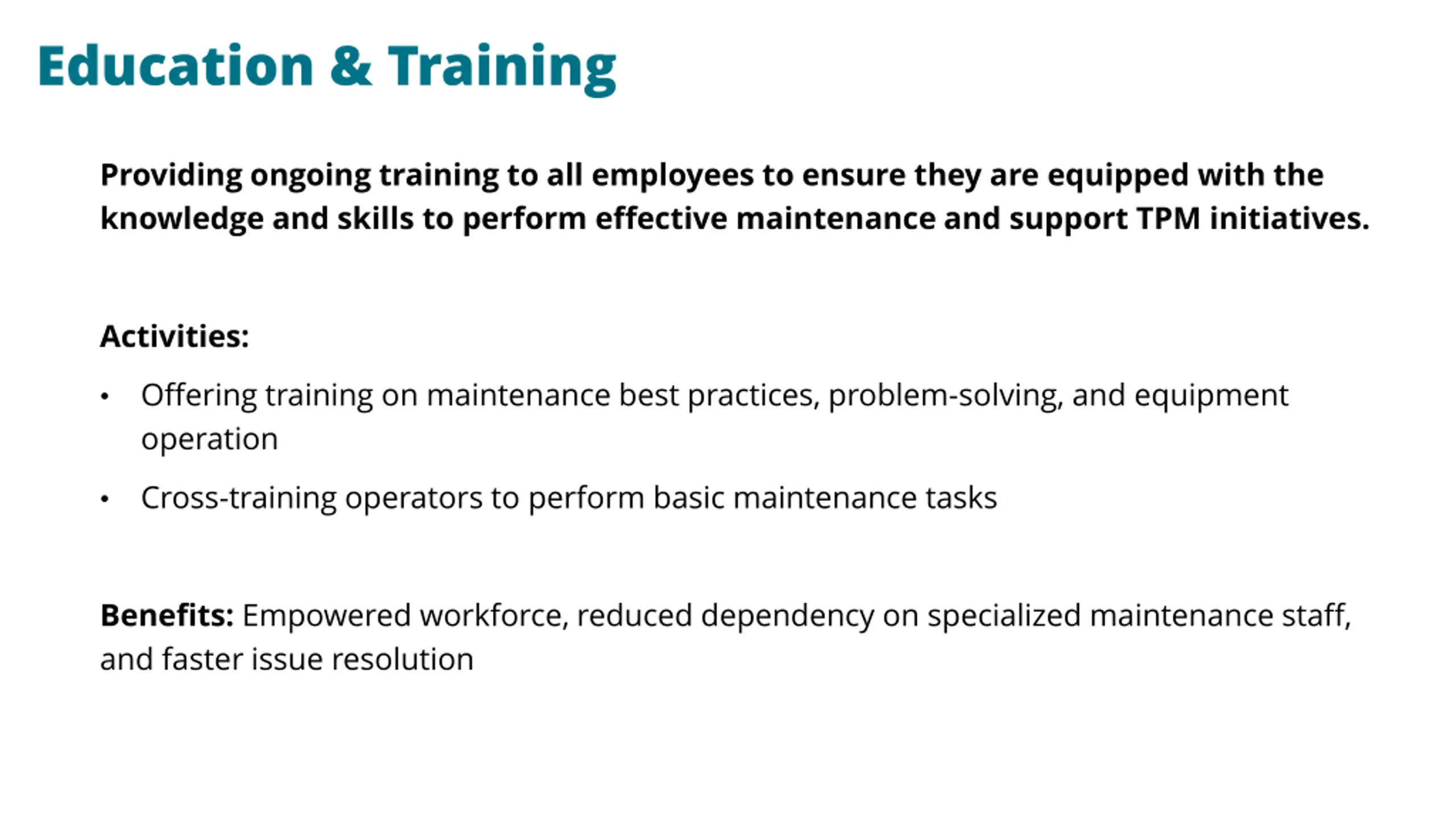 Education & Training Providing ongoing training to all employees to ensure they are equipped with the knowledge and skills to perform effective maintenance and support TPM initiatives. Activities: Offering training on maintenance best practices, problem-solving, and equipment operation Cross-training operators to perform basic maintenance tasks Benefits: Empowered workforce, reduced dependency on specialized maintenance staff, and faster issue resolution