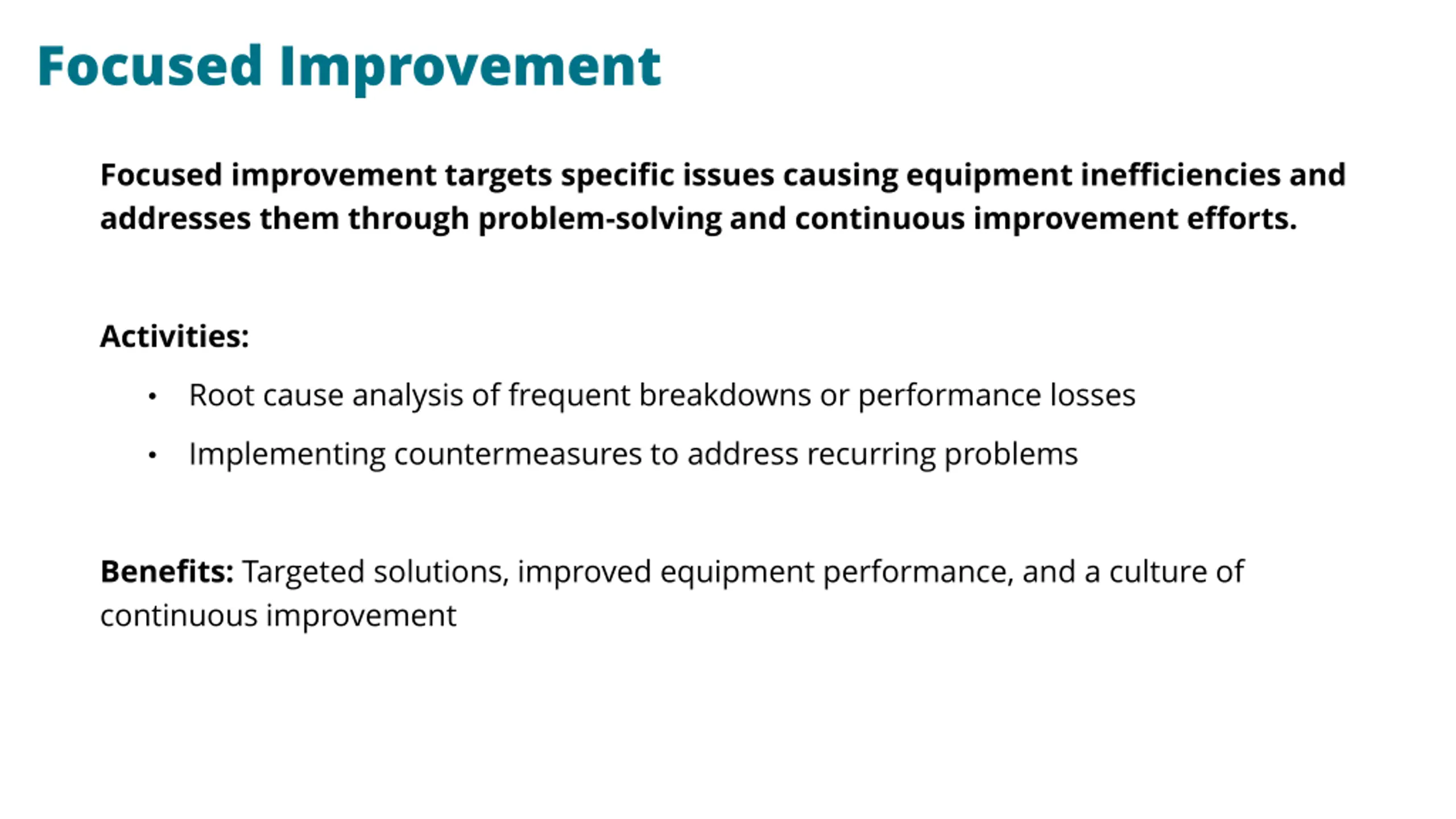 Focused Improvement Focused improvement targets specific issues causing equipment inefficiencies and addresses them through problem-solving and continuous improvement efforts. Activities: Root cause analysis of frequent breakdowns or performance losses Implementing countermeasures to address recurring problems Benefits: Targeted solutions, improved equipment performance, and a culture of continuous improvement