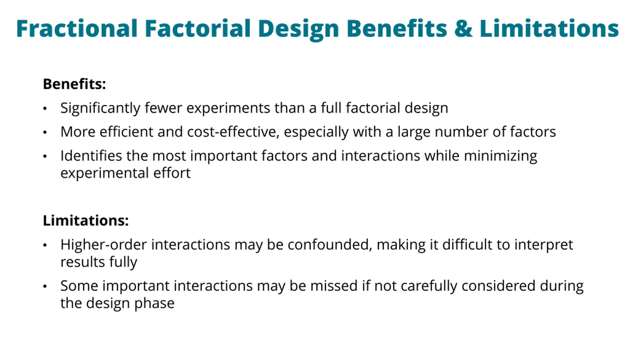 Fractional Factorial Design Benefits & Limitations Benefits: Significantly fewer experiments than a full factorial design More efficient and cost-effective, especially with a large number of factors Identifies the most important factors and interactions while minimizing experimental effort Limitations: Higher-order interactions may be confounded, making it difficult to interpret results fully Some important interactions may be missed if not carefully considered during the design phase