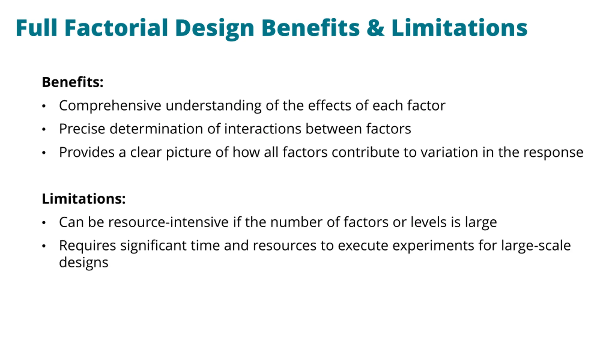 Full Factorial Design Benefits & Limitations Benefits: Comprehensive understanding of the effects of each factor Precise determination of interactions between factors Provides a clear picture of how all factors contribute to variation in the response Limitations: Can be resource-intensive if the number of factors or levels is large Requires significant time and resources to execute experiments for large-scale designs
