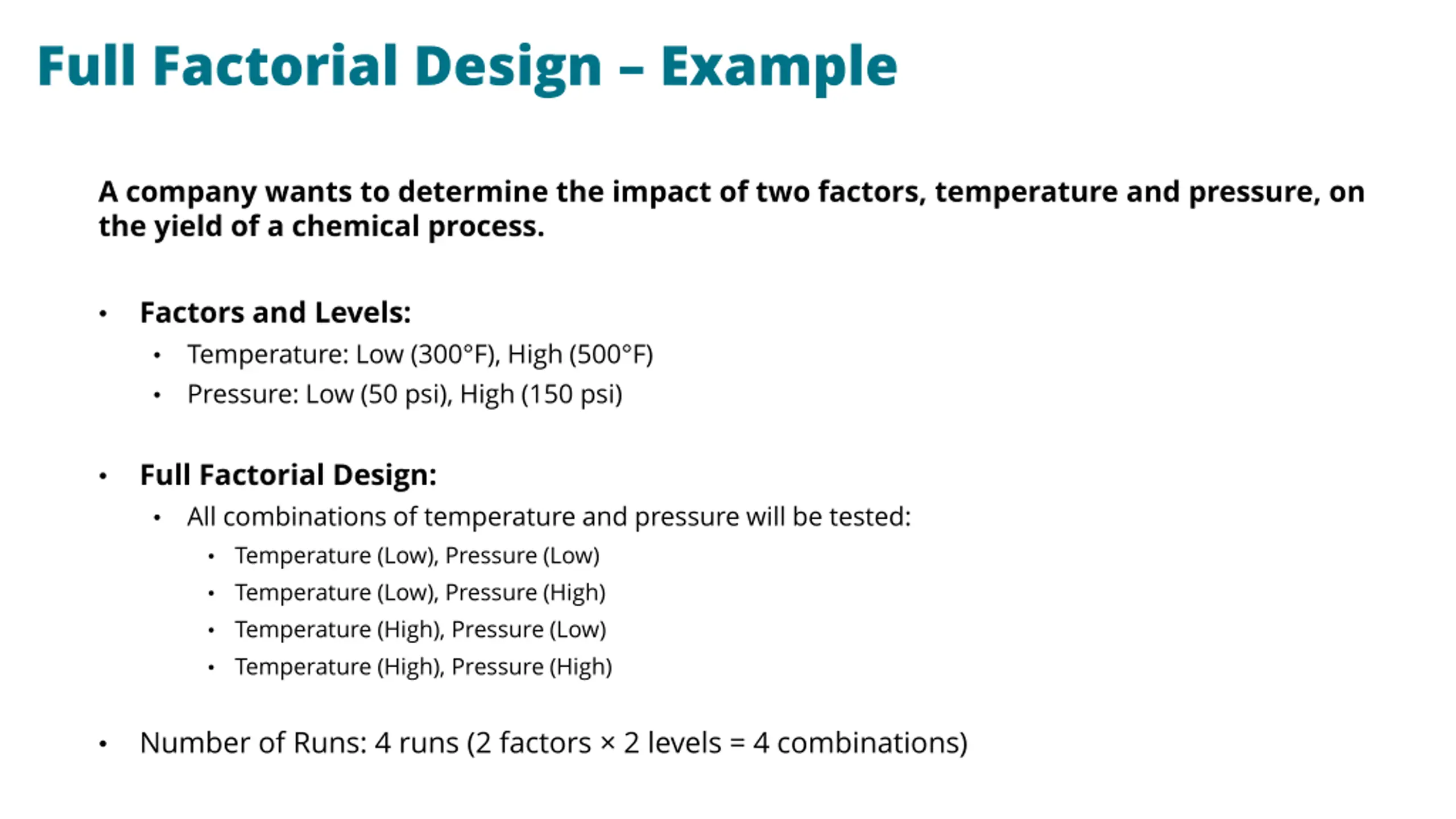 Full Factorial Design Example A company wants to determine the impact of two factors, temperature and pressure, on the yield of a chemical process. Factors and Levels: Temperature: Low (300 F), High (500 F) Pressure: Low (50 psi), High (150 psi) Full Factorial Design: All combinations of temperature and pressure will be tested: Temperature (Low), Pressure (Low) Temperature (Low), Pressure (High) Temperature (High), Pressure (Low) Temperature (High), Pressure (High) Number of Runs: 4 runs (2 factors 2 levels = 4 combinations)