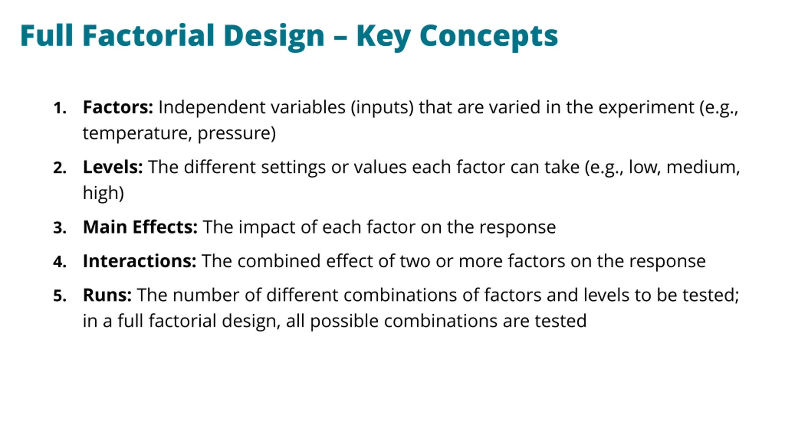 Full Factorial Design Key Concepts 1. Factors: Independent variables (inputs) that are varied in the experiment (e.g., temperature, pressure) 2. Levels: The different settings or values each factor can take (e.g., low, medium, high) 3. Main Effects: The impact of each factor on the response 4. Interactions: The combined effect of two or more factors on the response 5. Runs: The number of different combinations of factors and levels to be tested; in a full factorial design, all possible combinations are tested