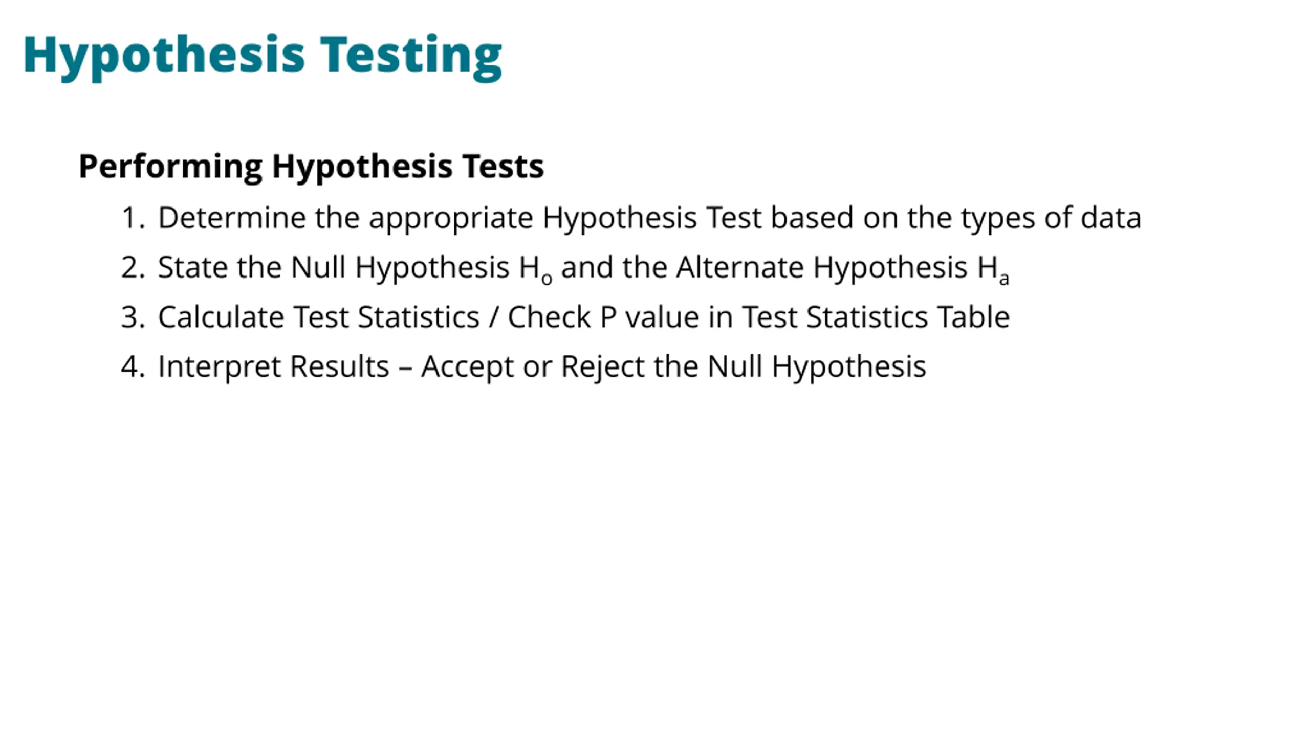 Hypothesis Testing Performing Hypothesis Tests 1. Determine the appropriate Hypothesis Test based on the types of data 2. State the Null Hypothesis Ho and the Alternate Hypothesis Ha 3. Calculate Test Statistics / Check P value in Test Statistics Table 4. Interpret Results Accept or Reject the Null Hypothesis