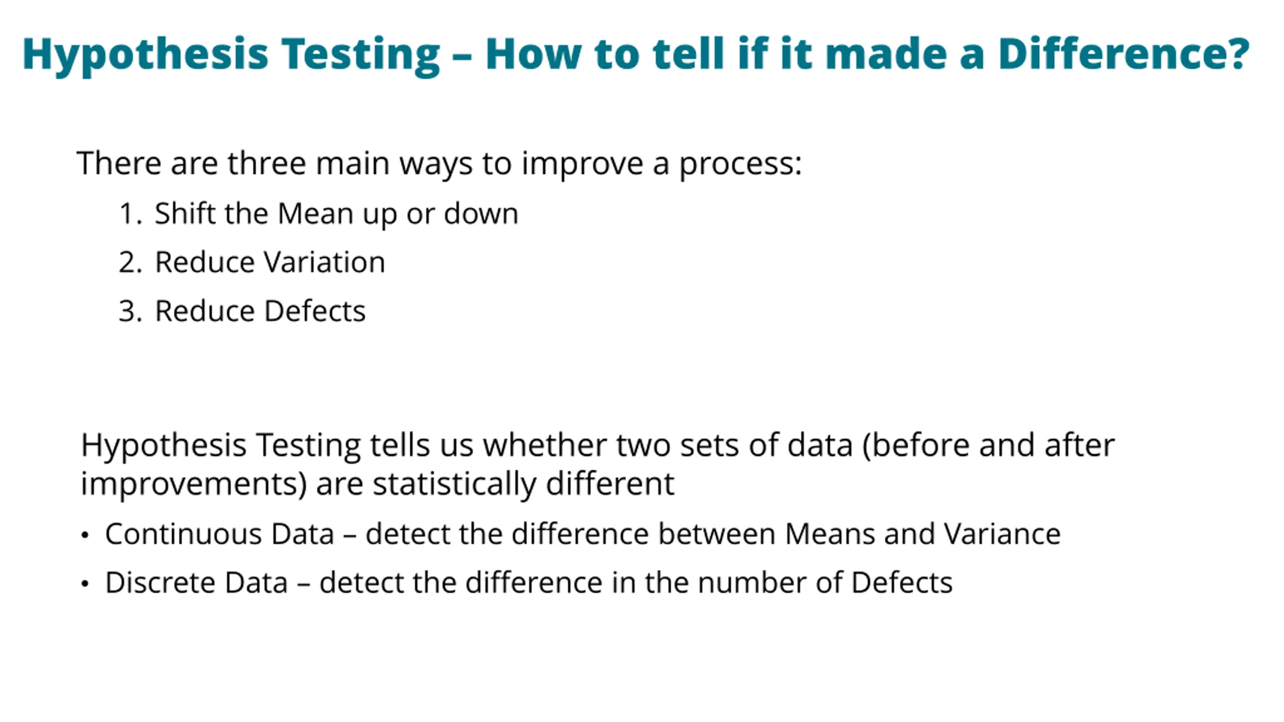 Hypothesis Testing How to tell if it made a Difference? There are three main ways to improve a process: 1. Shift the Mean up or down 2. Reduce Variation 3. Reduce Defects Hypothesis Testing tells us whether two sets of data (before and after improvements) are statistically different Continuous Data detect the difference between Means and Variance Discrete Data detect the difference in the number of Defects