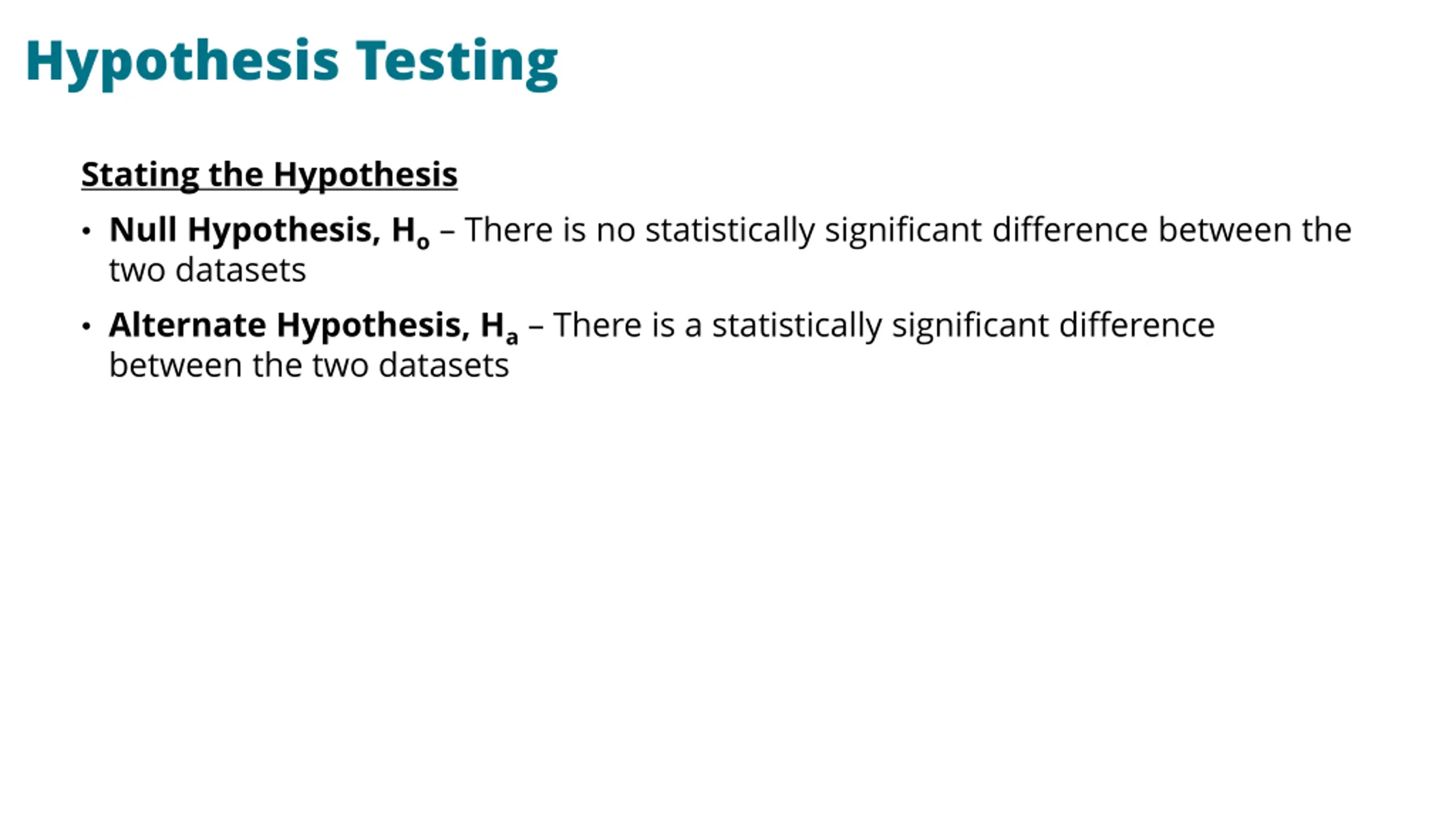 Hypothesis Testing Stating the Hypothesis Null Hypothesis, Ho There is no statistically significant difference between the two datasets Alternate Hypothesis, Ha There is a statistically significant difference between the two datasets