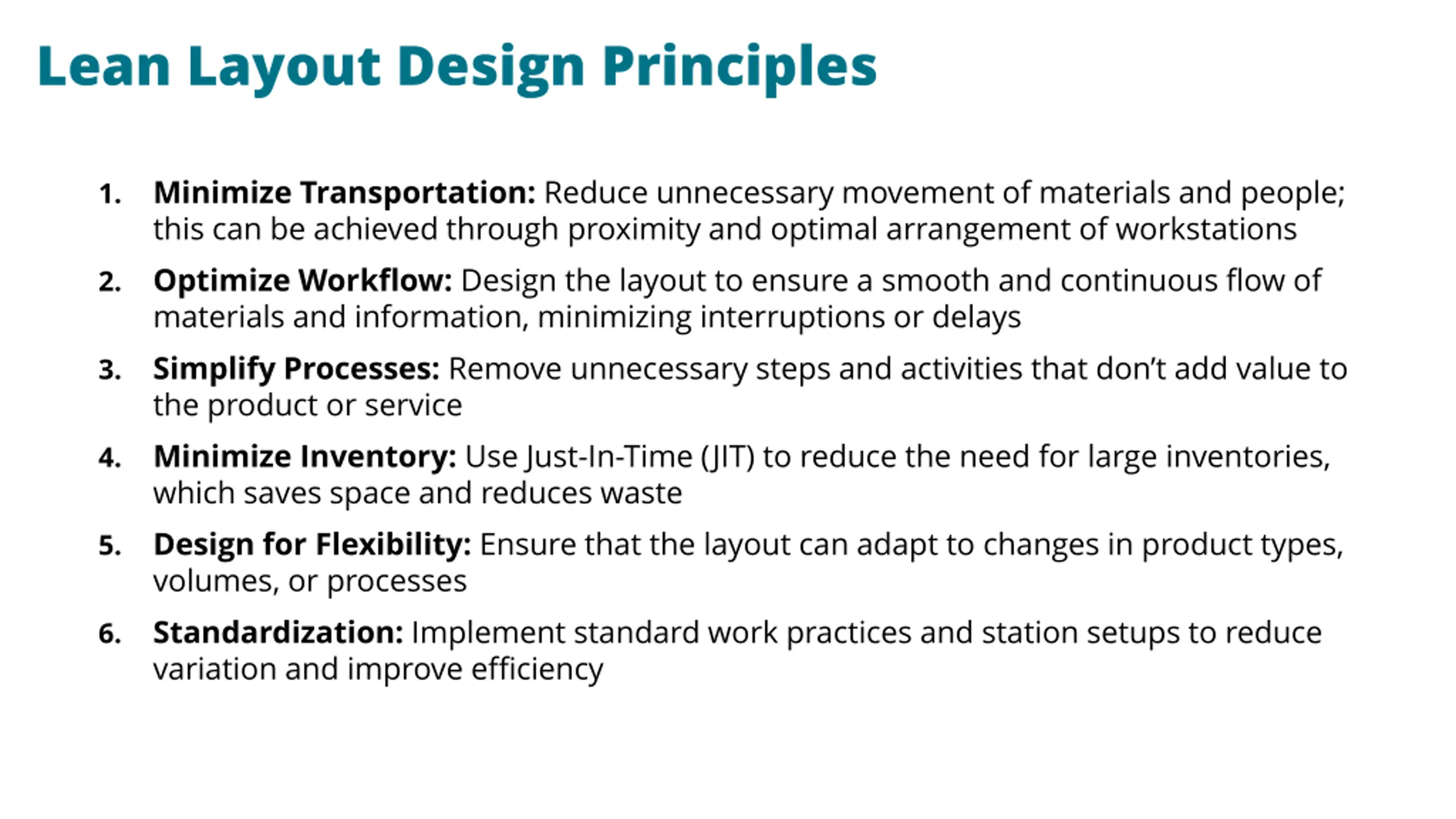 Lean Layout Design Principles Minimize Transportation: Reduce unnecessary movement of materials and people; this can be achieved through proximity and optimal arrangement of workstations Optimize Workflow: Design the layout to ensure a smooth and continuous flow of materials and information, minimizing interruptions or delays Simplify Processes: Remove unnecessary steps and activities that don t add value to the product or service Minimize Inventory: Use Just-In-Time (JIT) to reduce the need for large inventories, which saves space and reduces waste Design for Flexibility: Ensure that the layout can adapt to changes in product types, volumes, or processes Standardization: Implement standard work practices and station setups to reduce variation and improve efficiency 1. 2. 3. 4. 5. 6.