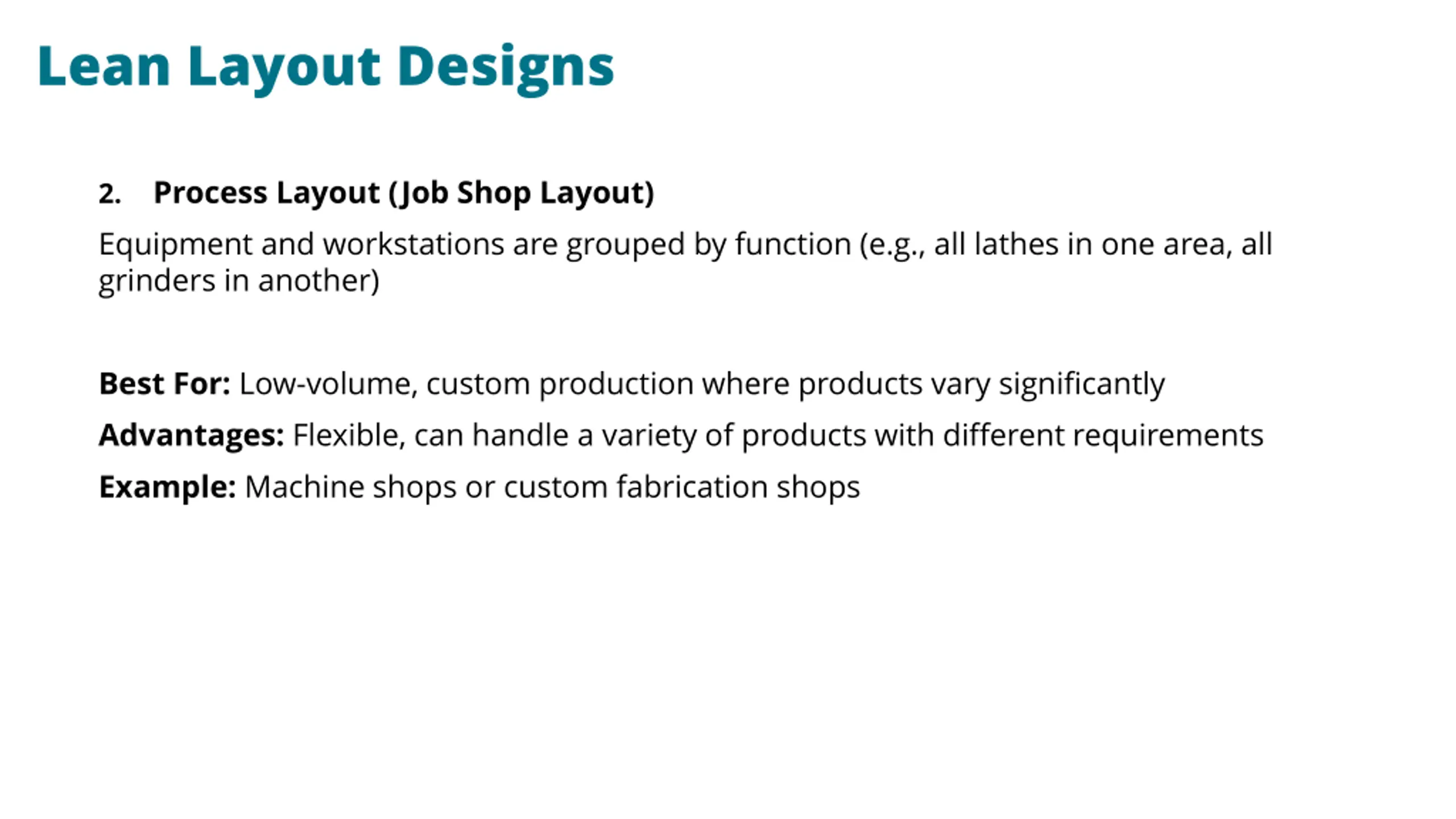 Lean Layout Designs Process Layout (Job Shop Layout) 2. Equipment and workstations are grouped by function (e.g., all lathes in one area, all grinders in another) Best For: Low-volume, custom production where products vary significantly Advantages: Flexible, can handle a variety of products with different requirements Example: Machine shops or custom fabrication shops