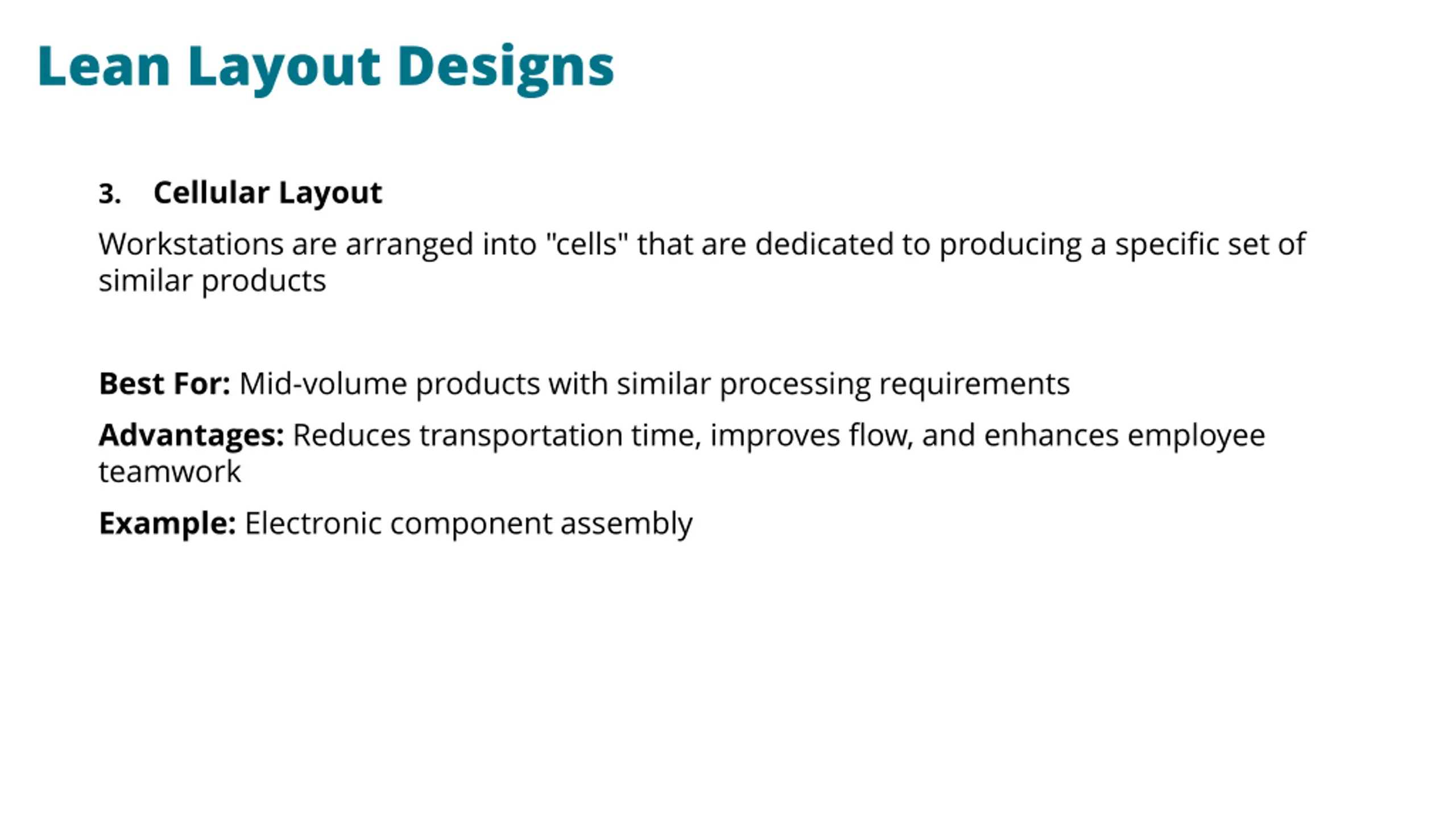 Lean Layout Designs Cellular Layout 3. Workstations are arranged into "cells" that are dedicated to producing a specific set of similar products Best For: Mid-volume products with similar processing requirements Advantages: Reduces transportation time, improves flow, and enhances employee teamwork Example: Electronic component assembly