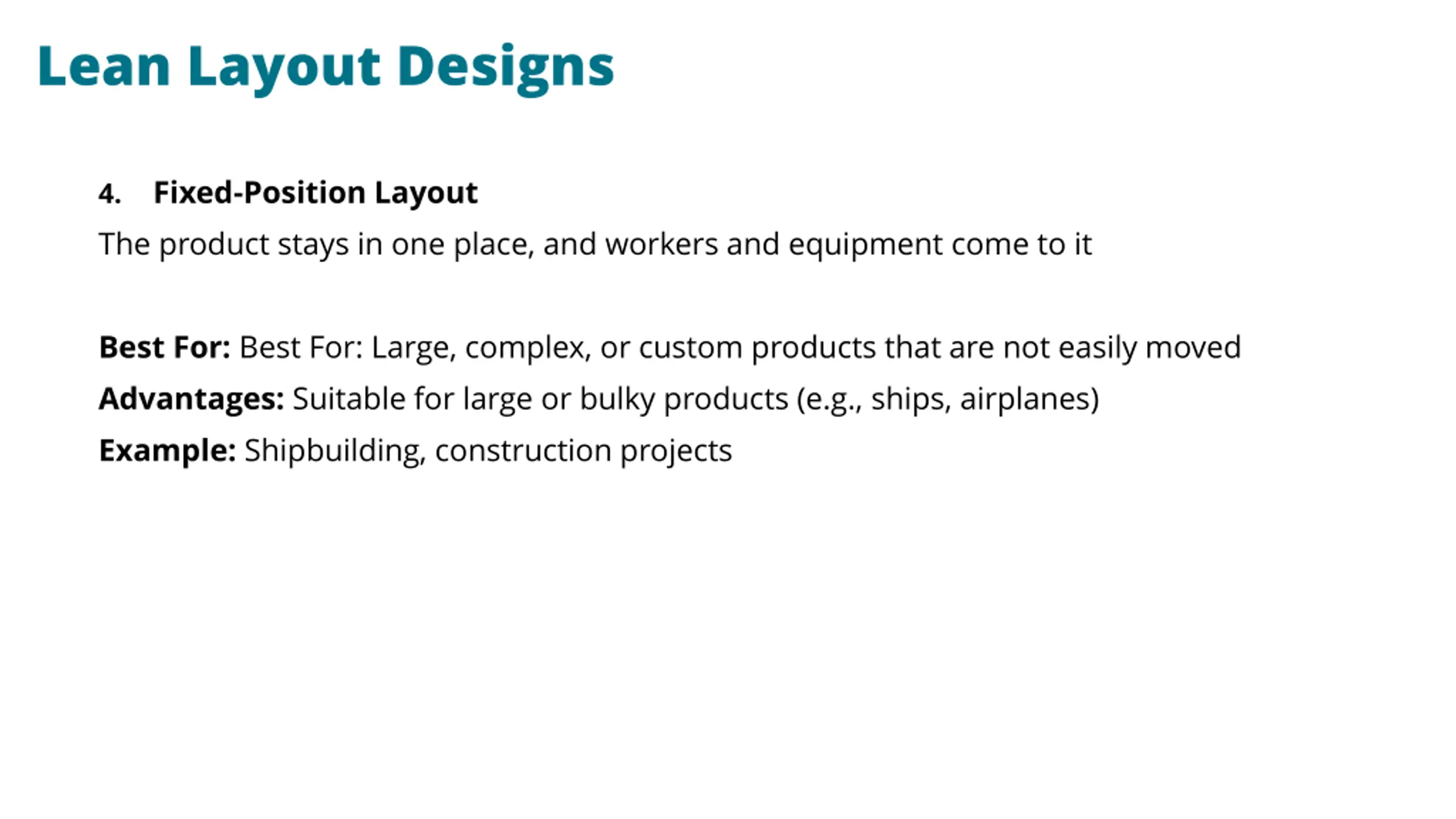 Lean Layout Designs Fixed-Position Layout 4. The product stays in one place, and workers and equipment come to it Best For: Best For: Large, complex, or custom products that are not easily moved Advantages: Suitable for large or bulky products (e.g., ships, airplanes) Example: Shipbuilding, construction projects