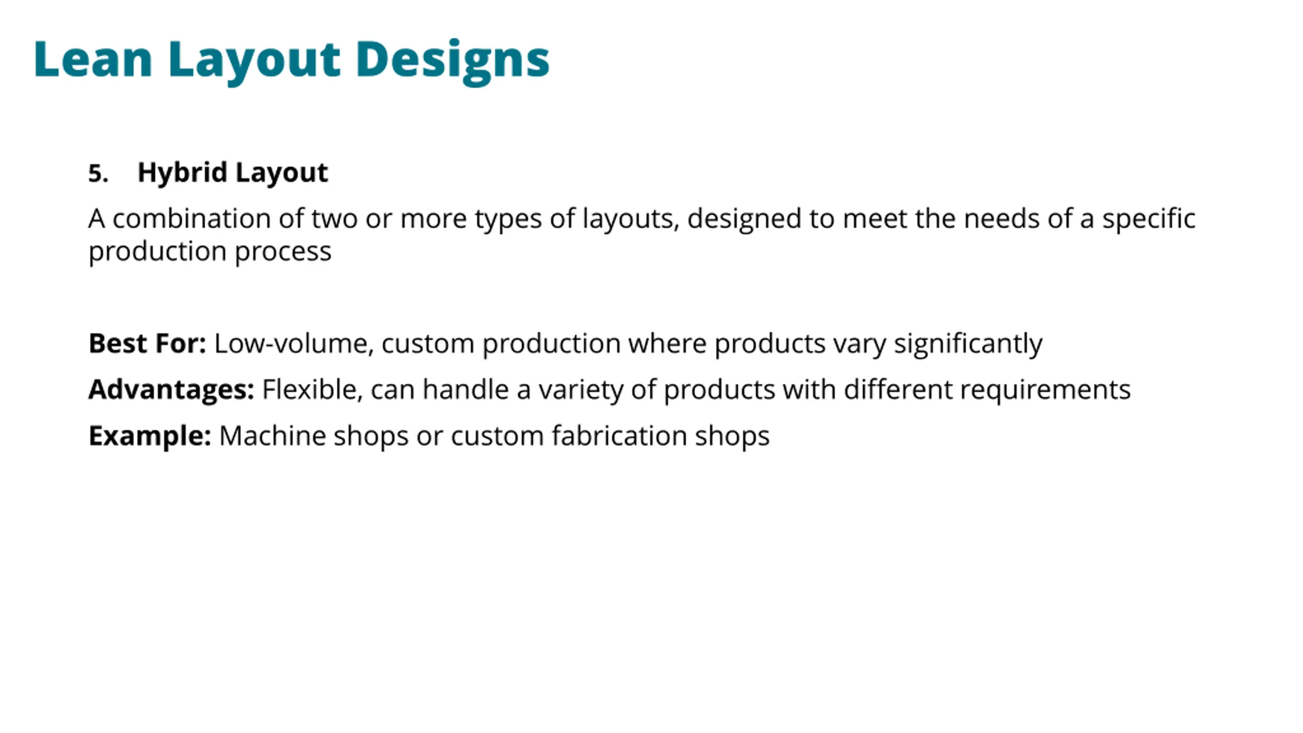 Lean Layout Designs Hybrid Layout 5. A combination of two or more types of layouts, designed to meet the needs of a specific production process Best For: Low-volume, custom production where products vary significantly Advantages: Flexible, can handle a variety of products with different requirements Example: Machine shops or custom fabrication shops