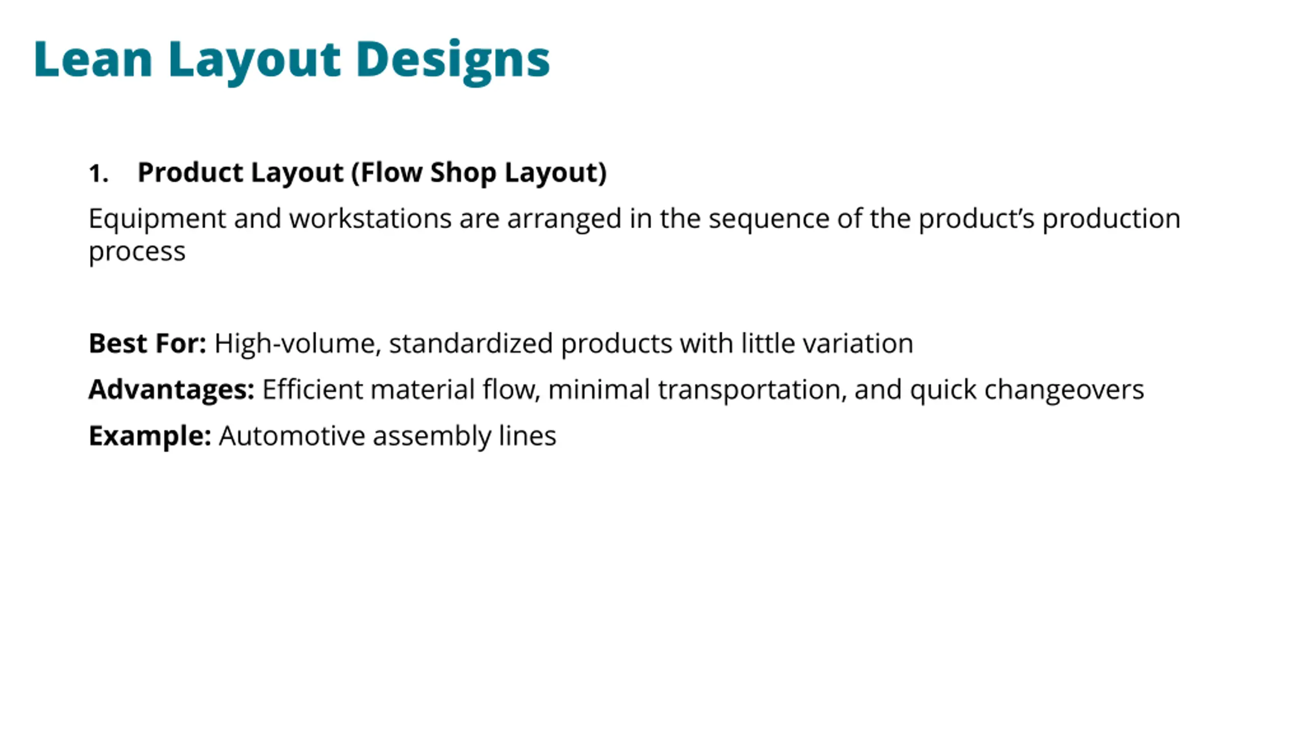 Lean Layout Designs Product Layout (Flow Shop Layout) 1. Equipment and workstations are arranged in the sequence of the product s production process Best For: High-volume, standardized products with little variation Advantages: Efficient material flow, minimal transportation, and quick changeovers Example: Automotive assembly lines