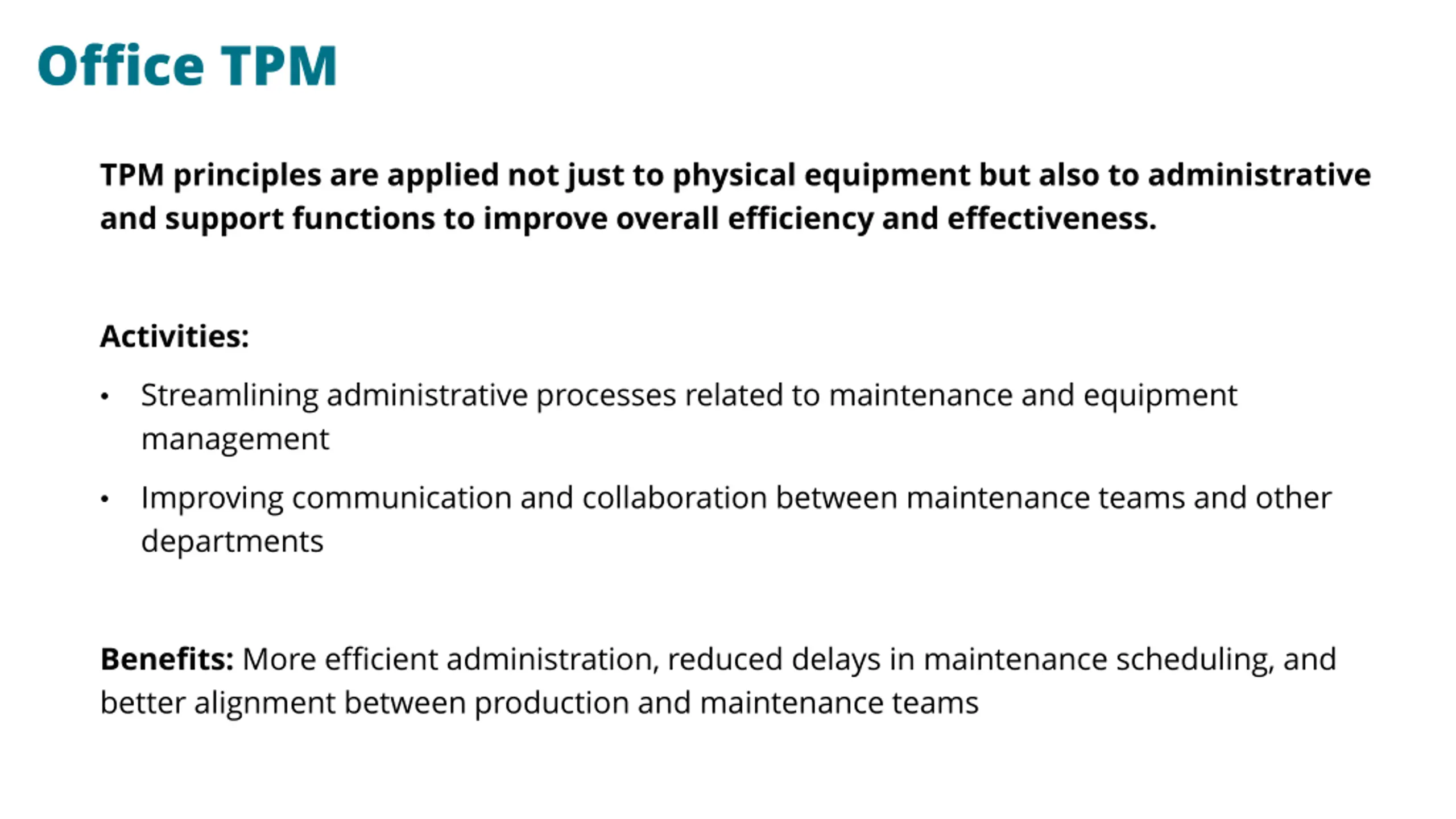 Office TPM TPM principles are applied not just to physical equipment but also to administrative and support functions to improve overall efficiency and effectiveness. Activities: Streamlining administrative processes related to maintenance and equipment management Improving communication and collaboration between maintenance teams and other departments Benefits: More efficient administration, reduced delays in maintenance scheduling, and better alignment between production and maintenance teams