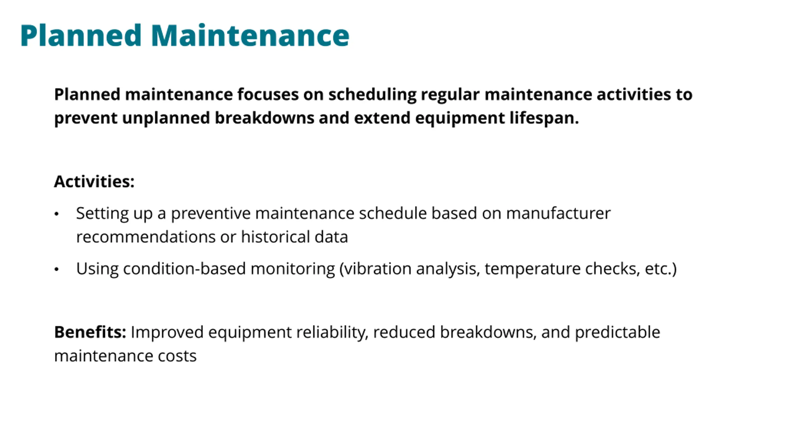 Planned Maintenance Planned maintenance focuses on scheduling regular maintenance activities to prevent unplanned breakdowns and extend equipment lifespan. Activities: Setting up a preventive maintenance schedule based on manufacturer recommendations or historical data Using condition-based monitoring (vibration analysis, temperature checks, etc.) Benefits: Improved equipment reliability, reduced breakdowns, and predictable maintenance costs