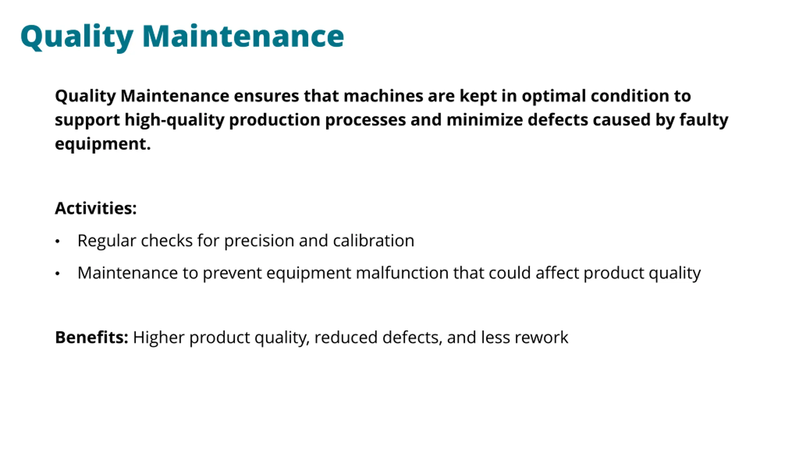 Quality Maintenance Quality Maintenance ensures that machines are kept in optimal condition to support high-quality production processes and minimize defects caused by faulty equipment. Activities: Regular checks for precision and calibration Maintenance to prevent equipment malfunction that could affect product quality Benefits: Higher product quality, reduced defects, and less rework