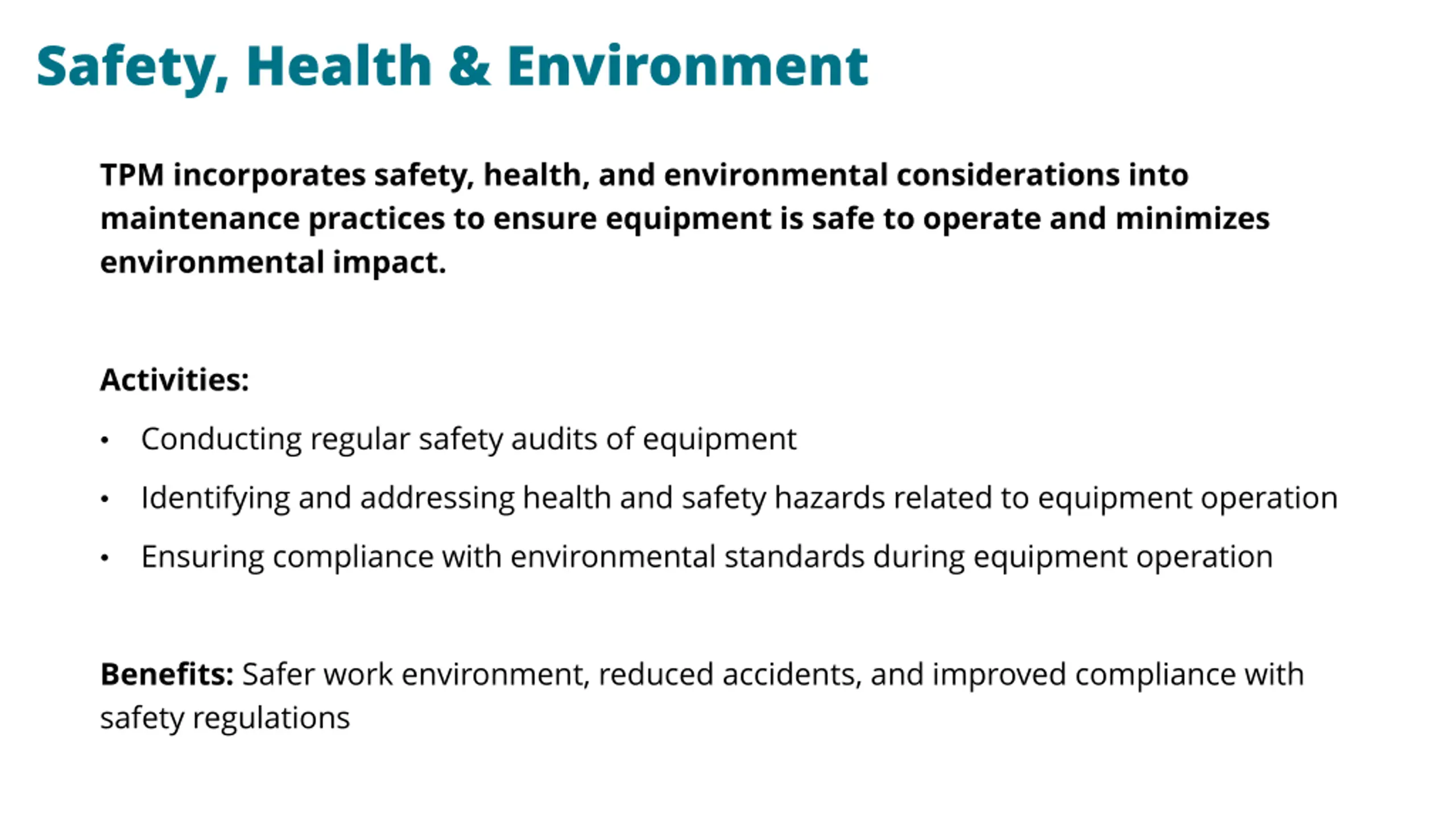 Safety, Health & Environment TPM incorporates safety, health, and environmental considerations into maintenance practices to ensure equipment is safe to operate and minimizes environmental impact. Activities: Conducting regular safety audits of equipment Identifying and addressing health and safety hazards related to equipment operation Ensuring compliance with environmental standards during equipment operation Benefits: Safer work environment, reduced accidents, and improved compliance with safety regulations