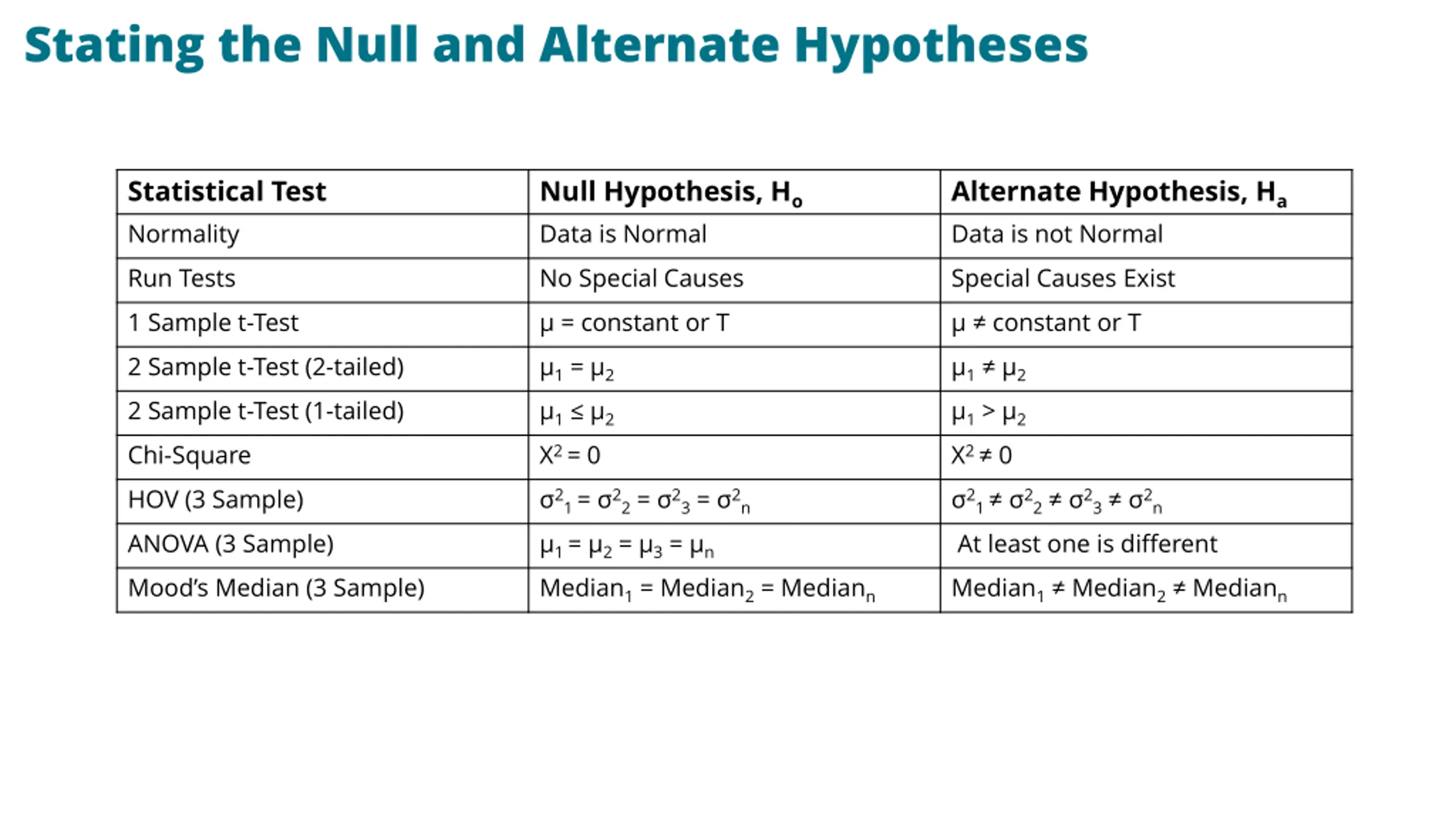 Stating the Null and Alternate Hypotheses Statistical Test Normality Run Tests 1 Sample t-Test 2 Sample t-Test (2-tailed) 2 Sample t-Test (1-tailed) Chi-Square HOV (3 Sample) ANOVA (3 Sample) Mood s Median (3 Sample) Null Hypothesis, Ho Data is Normal No Special Causes = constant or T 1 = 2 1 2 2 = 0 21 = 22 = 23 = 2n 1 = 2 = 3 = n Median1 = Median2 = Mediann Alternate Hypothesis, Ha Data is not Normal Special Causes Exist constant or T 1 2 1 > 2 2 0 21 22 23 2n At least one is different Median1 Median2 Mediann
