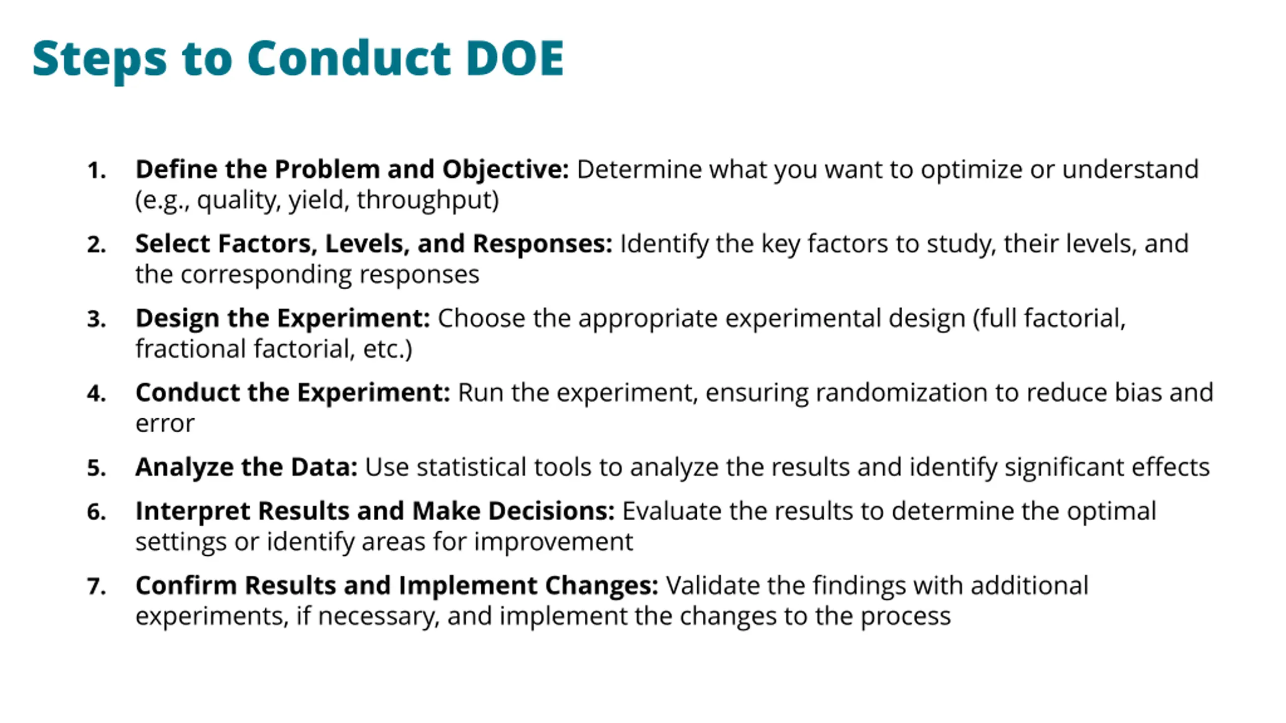 Steps to Conduct DOE Define the Problem and Objective: Determine what you want to optimize or understand (e.g., quality, yield, throughput) Select Factors, Levels, and Responses: Identify the key factors to study, their levels, and the corresponding responses Design the Experiment: Choose the appropriate experimental design (full factorial, fractional factorial, etc.) Conduct the Experiment: Run the experiment, ensuring randomization to reduce bias and error Analyze the Data: Use statistical tools to analyze the results and identify significant effects Interpret Results and Make Decisions: Evaluate the results to determine the optimal settings or identify areas for improvement Confirm Results and Implement Changes: Validate the findings with additional experiments, if necessary, and implement the changes to the process 1. 2. 3. 4. 5. 6. 7.