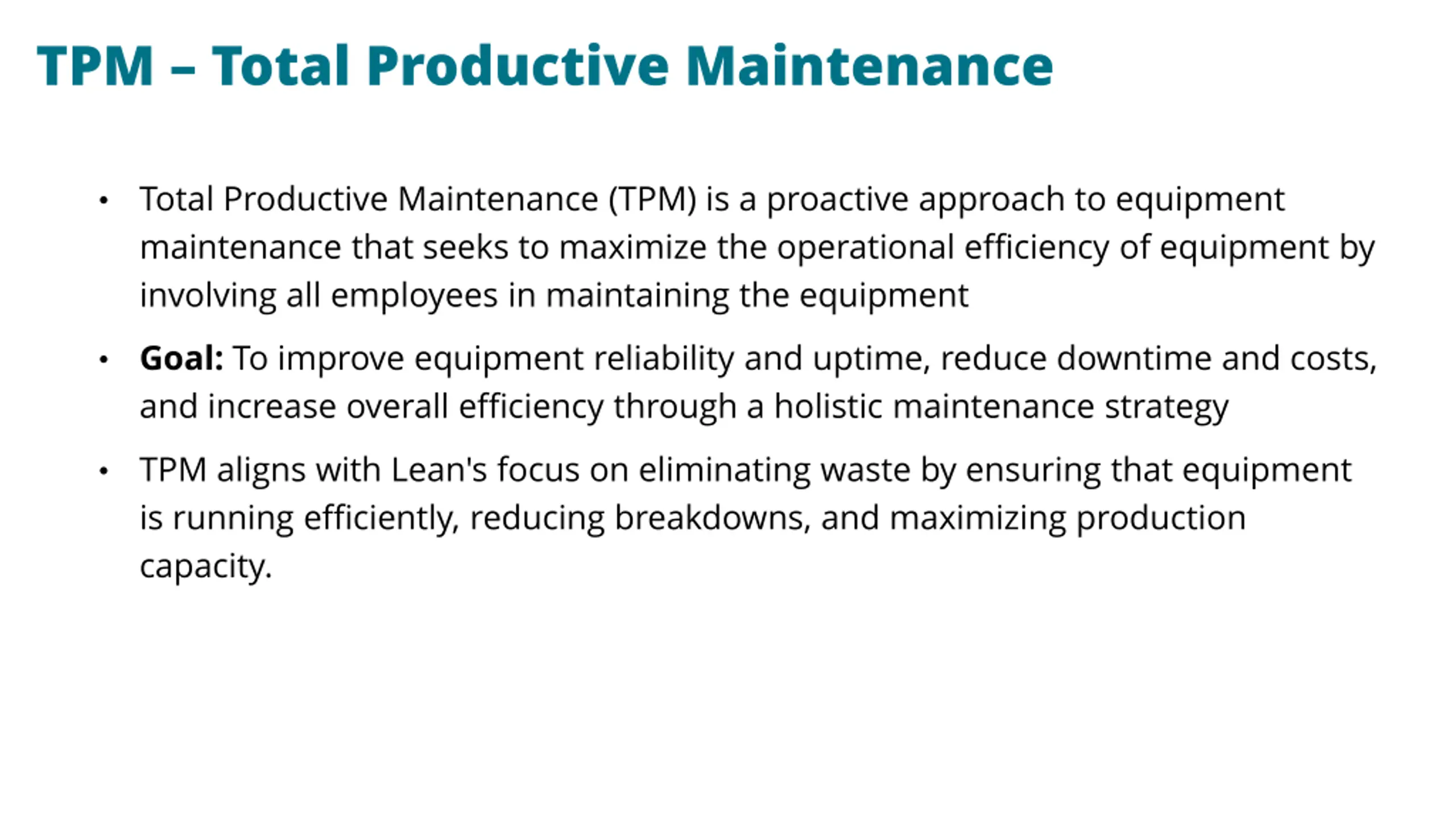 TPM Total Productive Maintenance Total Productive Maintenance (TPM) is a proactive approach to equipment maintenance that seeks to maximize the operational efficiency of equipment by involving all employees in maintaining the equipment Goal: To improve equipment reliability and uptime, reduce downtime and costs, and increase overall efficiency through a holistic maintenance strategy TPM aligns with Lean's focus on eliminating waste by ensuring that equipment is running efficiently, reducing breakdowns, and maximizing production capacity.